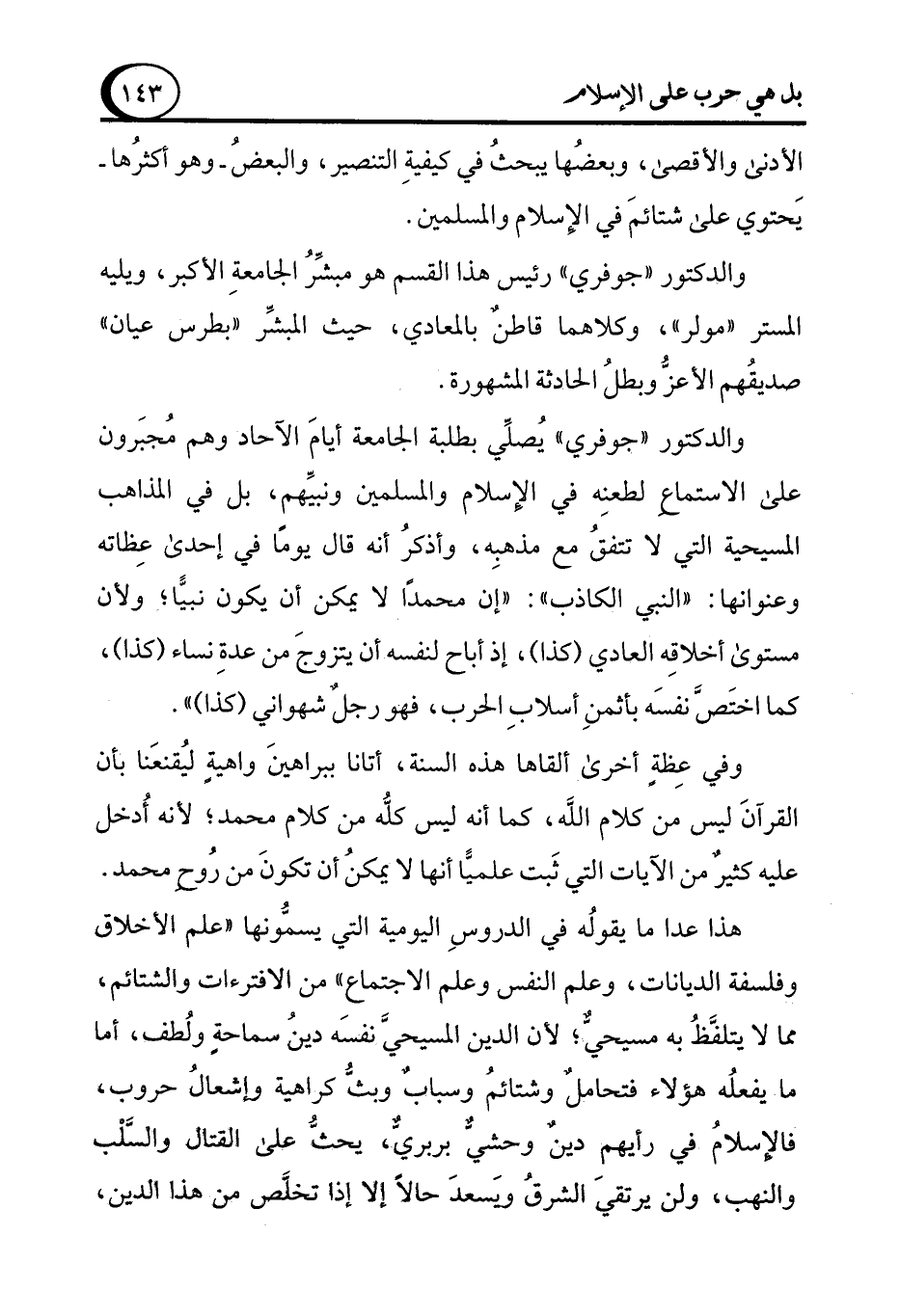والدكتور "جوفري" يصلِّي بطلبة الجامعة أيامَ الآحاد وهم مجبَرون على الاستماع لطعنِه في الإسلام والمسلمين ونبيهم، بل في المذاهب المسيحية التي لا تتفق مع مذهبِه، وأذكر أنه قال يومًا في إحدى عِظاته وعنوانها: "النبي الكاذب": "إن محمداً لا يمكن أن يكون نبيًّا" ولأن مستوى أخلاقِه العادي (كذا)، إذ أباح لنفسه أن يتزوجَ من عدةِ نساء (كذا)، كما اختَصَّ نفسَه بأثمنِ أسلابِ الحرب، فهو رجلٌ شهواني (كذا) ".