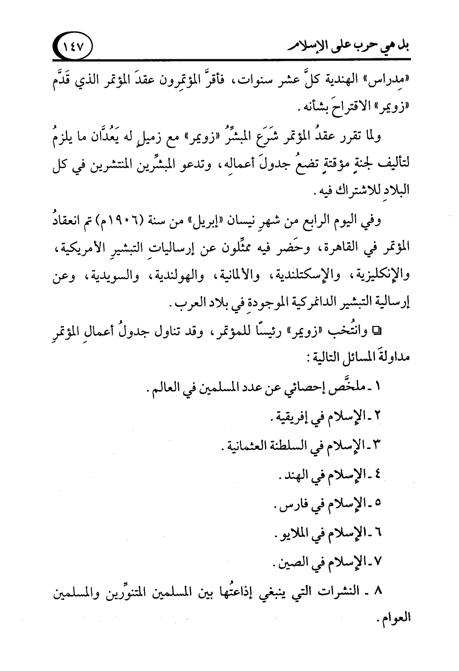 ° وانتُخب "زويمر" رئيسًا للمؤتمر، وقد تناول جدولُ أعمالِ المؤتمرِ مداولةَ المسائل التالية: