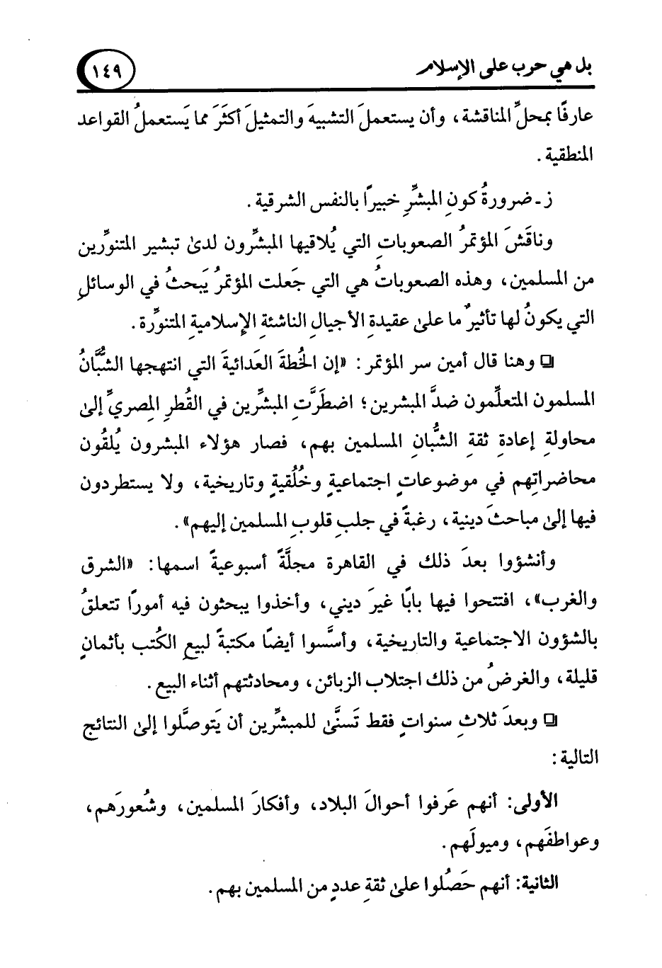 ° وهنا قال أمين سر المؤتمر: "إن الخُطةَ العَدائيةَ التي انتهجها الشُّبَّانُ المسلمون المتعلِّمون ضدَّ المبشرين؛ اضطَرَّتِ المبشرين في القطرِ المِصري إلى محاولةِ إعادةِ ثقةِ الشُّبانِ المسلمين بهم، فصار هؤلاء المبشرون يُلقُون محاضراتِهم في موضوعاتٍ اجتماعيةٍ وخُلُقيةٍ وتاريخية، ولا يستطردون فيها إلى مباحثَ دينية، رغبةً في جلبِ قلوبِ المسلمين إليهم".