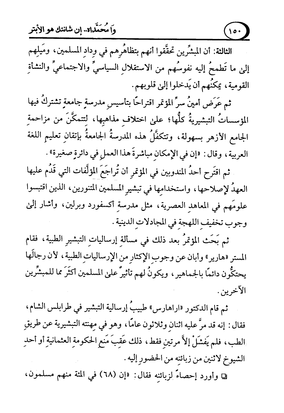ثم بَحَث المؤتمرُ بعد ذلك في مسألةِ إرسالياتِ التبشيرِ الطبية، فقام المستر "هارير" وأبان عن وجوبِ الإكثارِ من الإرسالياتِ الطبية، لأن رجالَها يحتكُّون دائمًا بالجماهير، ويكونُ لهم تأثيرٌ على المسلمين أكثَرَ مما للمبشرين الآخرين.