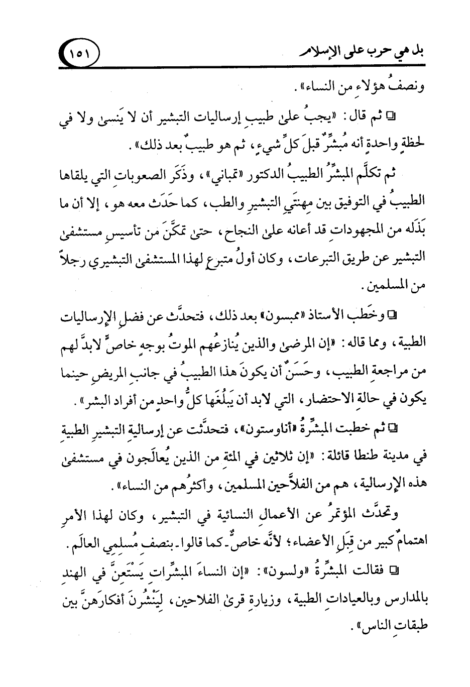 ° ثم قال: "يجب على طبيبِ إرساليات التبشير أن لا يَنسى ولا في لحظةٍ واحدةٍ أنه مبشِّر قبلَ كل شيءٍ، ثم هو طبيب بعد ذلك".