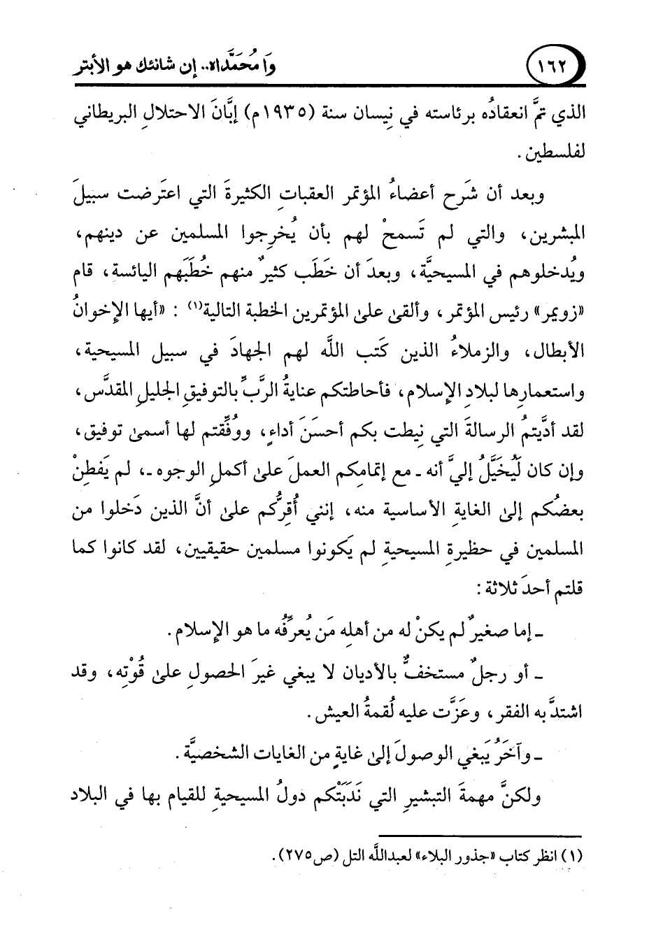 وبعد أن شَرح أعضاء المؤتمر العقباتِ الكثيرةَ التي اعتَرضت سبيلَ المبشرين، والتي لم تَسمحْ لهم بأن يُخرِجوا المسلمين عن دينهم، ويدخلوهم في المسيحية، وبعدَ أن خَطَب كثيرٌ منهم خُطَبَهم اليائسة، قام "زويمر" رئيس المؤتمر، وألقى على المؤتمرين الخطبة التالية (¬1): "أيها الإخوانُ الأبطال، والزملاءُ الذين كَتب الله لهم الجهادَ في سبيل المسيحية، واستعمارها لبلادِ الإسلام، فأحاطتكم عنايةُ الرَّبِّ بالتوفيقِ الجليل المقدَّس، لقد أدَّيتمَ الرسالةَ التي نِيطت بكم أحسَنَ أداءٍ، ووفِّقتم لها أسمى توفيق، وإن كان ليخَيَّلُ إليَّ أنه -مع إتمامِكم العملَ على أكمل الوجوه-، لم يَفطِنْ بعضكم إلى الغايةِ الأساسية منه، إنني أُقِرُّكم على أنَّ الذين دَخلوا من المسلمين في حظيرةِ المسيحيةِ لم يَكونوا مسلمين حقيقيين، لقد كانوا كما قلتم أحدَ ثلاثة: