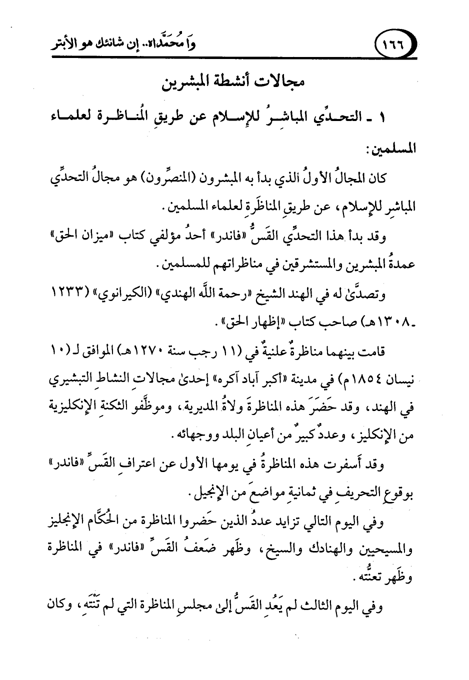 وقد بدأ هذا التحدِّي القَسُّ "فاندر" أحدُ مؤلفي كتاب "ميزان الحق" عمدةُ المبشرين والمستشرقين في مناظراتهم للمسلمين.
