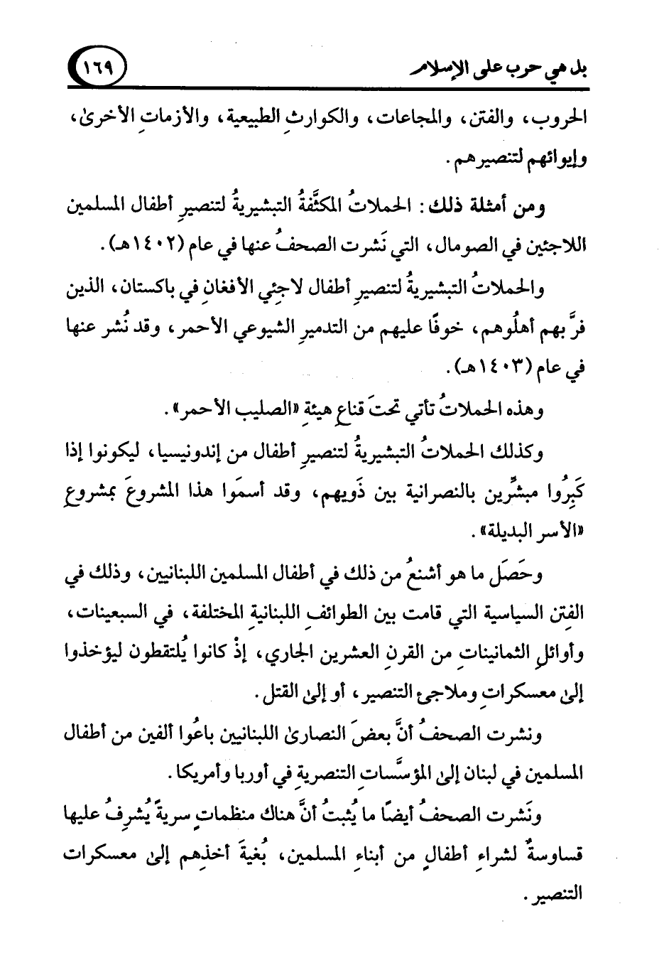 والحملاتُ التبشيريةُ لتنصيرِ أطفال لاجِئي الأفغانِ في باكستان، الذين فرَّ بهم أهلُوهم، خوفًا عليهم من التدميرِ الشيوعي الأحمر، وقد نُشر عنها في عام (1403 هـ).