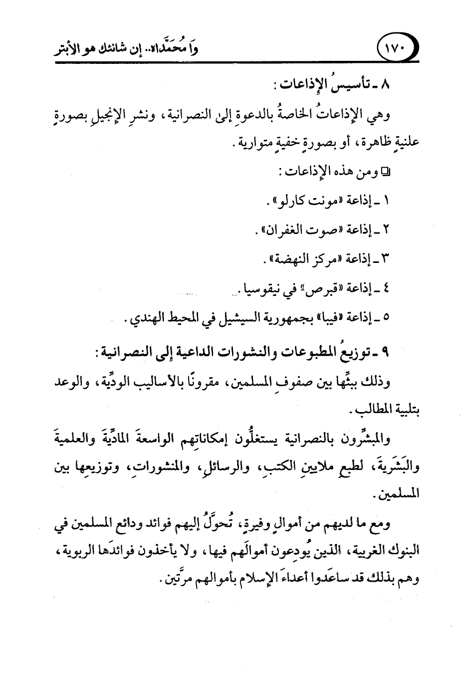 والمبشِّرون بالنصرانية يستغلُّون إمكاناتِهم الواسعةَ الماديةَ والعلميةَ والبَشَريةَ، لطبع ملايينِ الكتب، والرسائل، والمنشوراتِ، وتوزيعِها بين المسلمين.