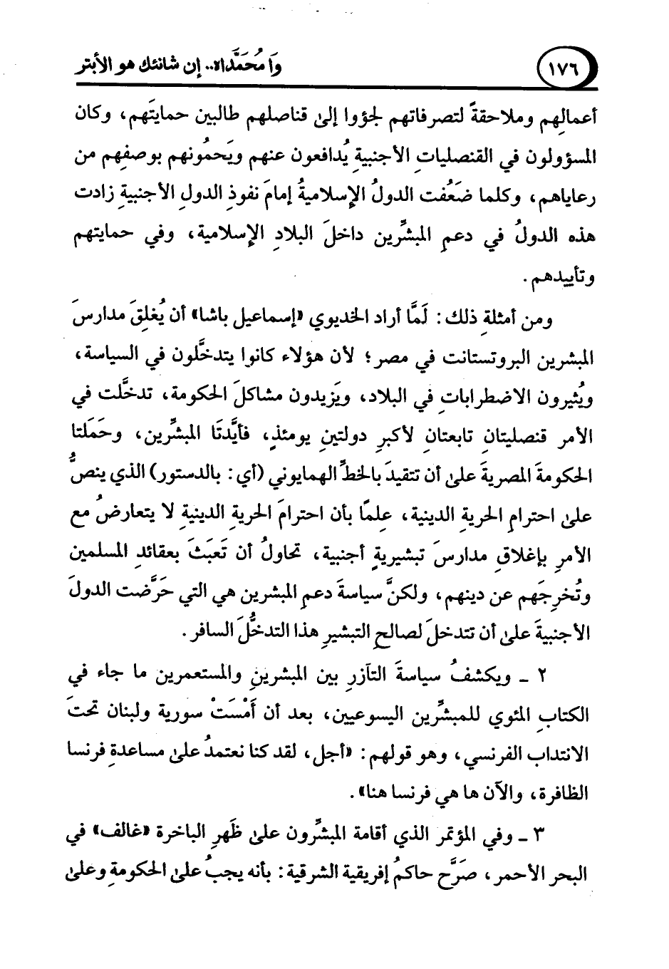 أعمالِهم وملاحقةً لتصرفاتهم لجؤوا إلى قناصلهم طالبين حمايتَهم، وكان المسؤولون في القنصلياتِ الأجنبيةِ يُدافعون عنهم ويَحمُونهم بوصفِهم من رعاياهم، وكلما ضَعُفت الدولُ الإسلاميةُ إمامَ نفوذِ الدولِ الأجنبيةِ زادت هذه الدولُ في دعم المبشِّرين داخلَ البلادِ الإسلامية، وفي حمايتهم وتأييدهم.