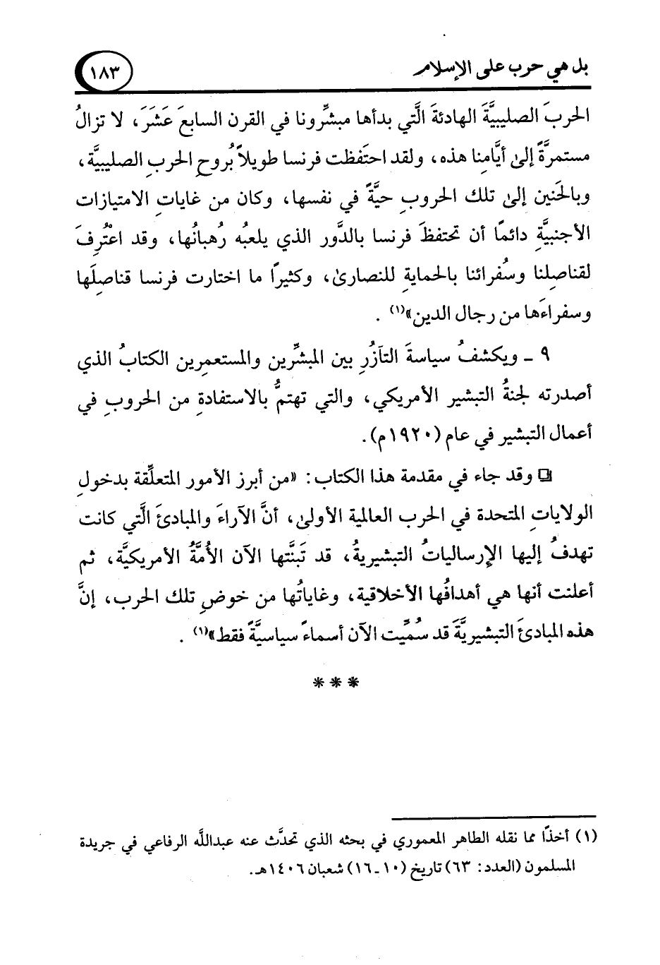 9 - ويكشفُ سياسةَ التآزر بين المبشِّرين والمستعمِرين الكتابُ الذي أصدرته لجنةُ التبشير الامريكي، والتي تهتمُّ بالاستفادةِ من الحروبِ في أعمال التبشير في عام (1920م).