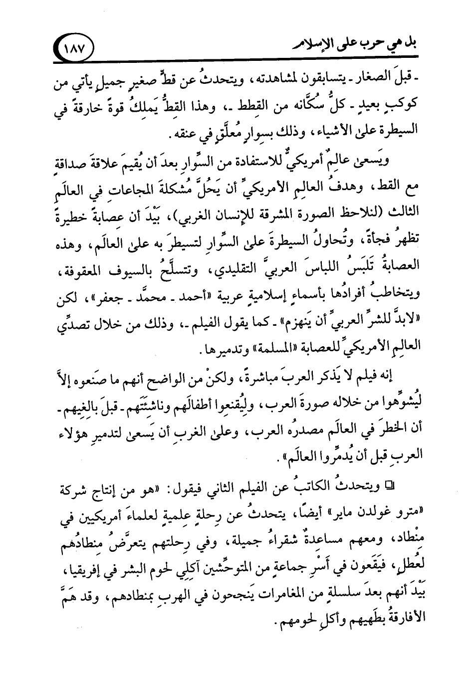إنه فيلم لا يَذكر العربَ مباشرةً، ولكنْ من الواضح أنهم ما صَنعوه إلاَّ ليُشوهوا من خلاله صورةَ العرب، ولِيُقنعِوا أطفالَهم وناشِئَتَهم -قبلَ بالِغِيهم- أن الخطرَ في العالَم مصدرة العرب، وعلى الغربِ أن يَسعى لتدميرِ هؤلاء العربِ قبل أن يُدمروا العالَم".