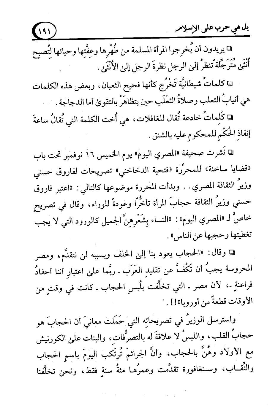 ° نَشرت صحيفة "المصري اليوم" يوم الخميس 16 نوفمبر تحت باب "قضايا ساخنة" للمحرِّرة "فتحية الدخاخني" تصريحات لفاروق حسني وزيرُ الثقافة المصري .. وبدأت المحررة موضوعها كالتالي: "اعتبر فاروق حسني وزير الثقافة حجابَ المرأة تأخُّرًا وعودةً للوراء، وقال في تصريح خاص لـ "المصري اليوم": "النساء بِشَعْرِهِنَّ الجميل كالورود التي لا يجب تغطيتها وحجبها عن الناس".