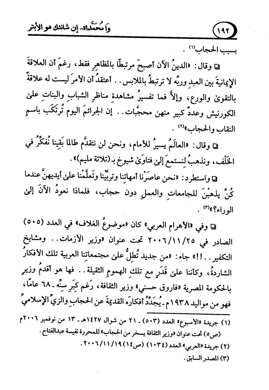 (¬1) جريدة "الأسبوع" العدد (503) - 21 من شوال 1427 هـ - 13 من نوفمبر 2006 م (ص5) تحت عنوان "وزير الثقافة يسخر من الحجاب " للمحررة نفيسة عبد الفتاح.