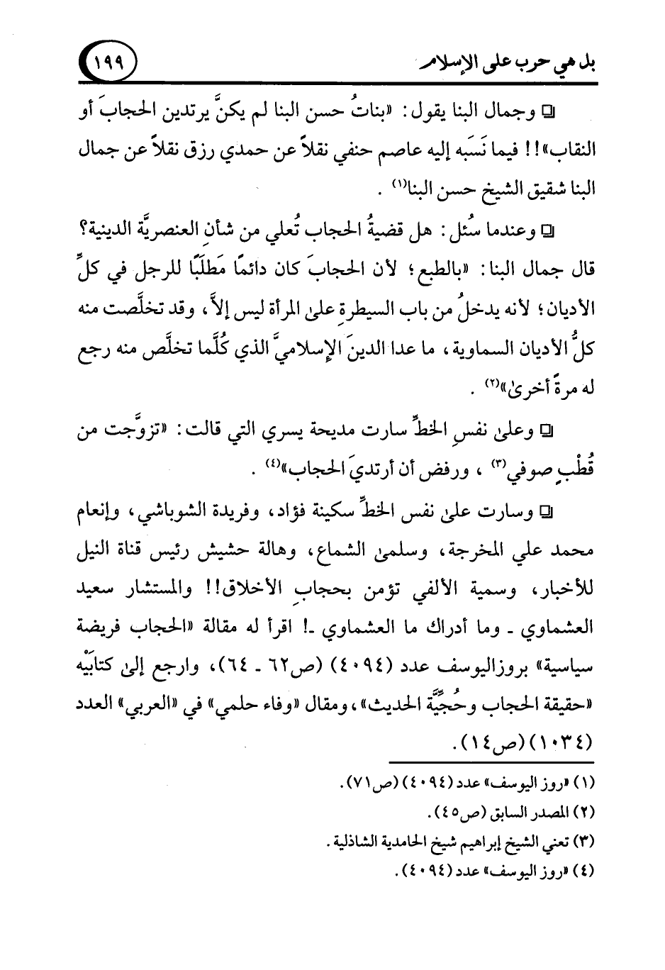 ° وسارت على نفس الخطِّ سكينة فؤاد، وفريدة الشوباشي، وإنعام محمد علي المخرجة، وسلمى الشماع، وهالة حشيش رئيس قناة النيل للأخبار، وسمية الألفي تؤمن بحجابِ الأخلاق!! والمستشار سعيد العشماوي -وما أدراك ما العشماوي-! اقرأ له مقالة "الحجاب فريضة سياسية" بروزاليوسف عدد (4094) (ص 62 - 64)، وارجع إلى كتابَيْه "حقيقة الحجاب وحُجِّيَّة الحديث"، ومقال "وفاء حلمي" في "العربي" العدد (1034) (ص 14).