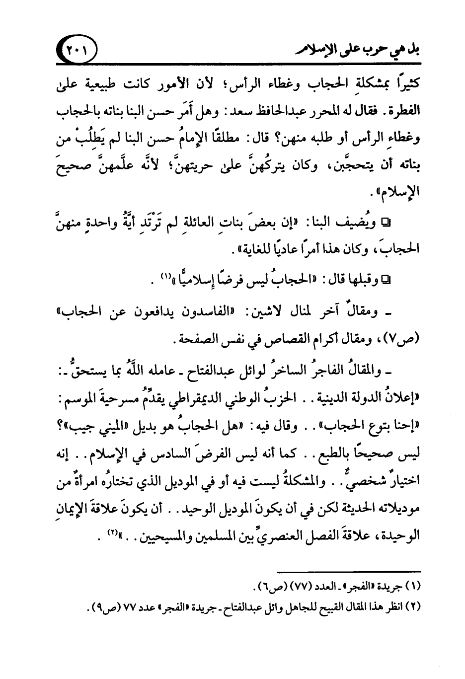 ° وقبلها قال:"الحجابُ ليس فرضًا إِسلاميًا" (¬1).