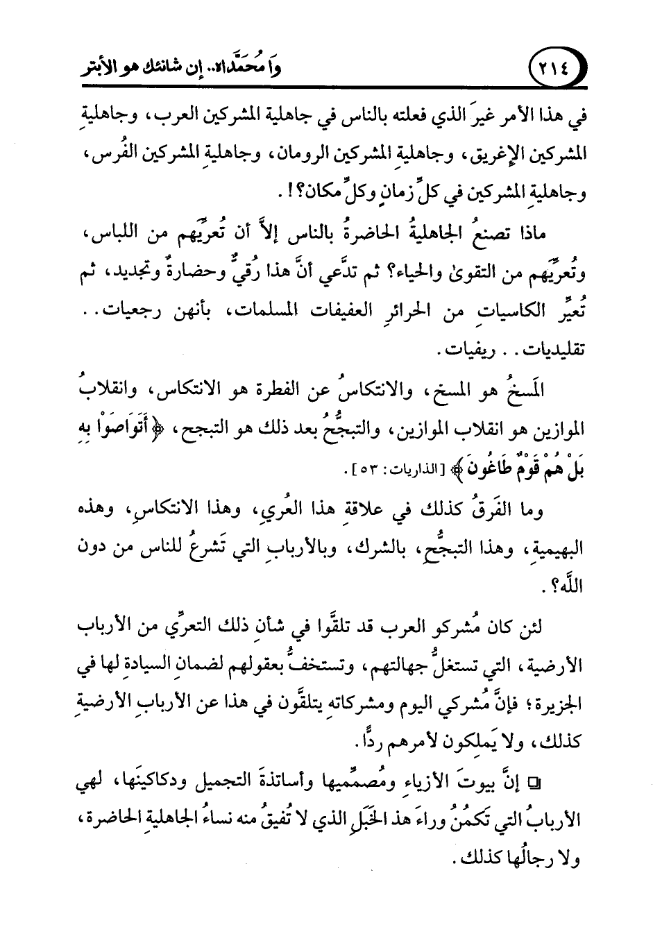 ° إن بيوتَ الأزياءِ ومُصمميها وأساتذةَ التجميل ودكاكينَها، لهي الأربابُ التي تَكمُنُ وراءَ هذ الخَبَل الذي لا تُفيقُ منه نساءُ الجاهليةِ الحاضرة، ولا رجالُها كذلك.