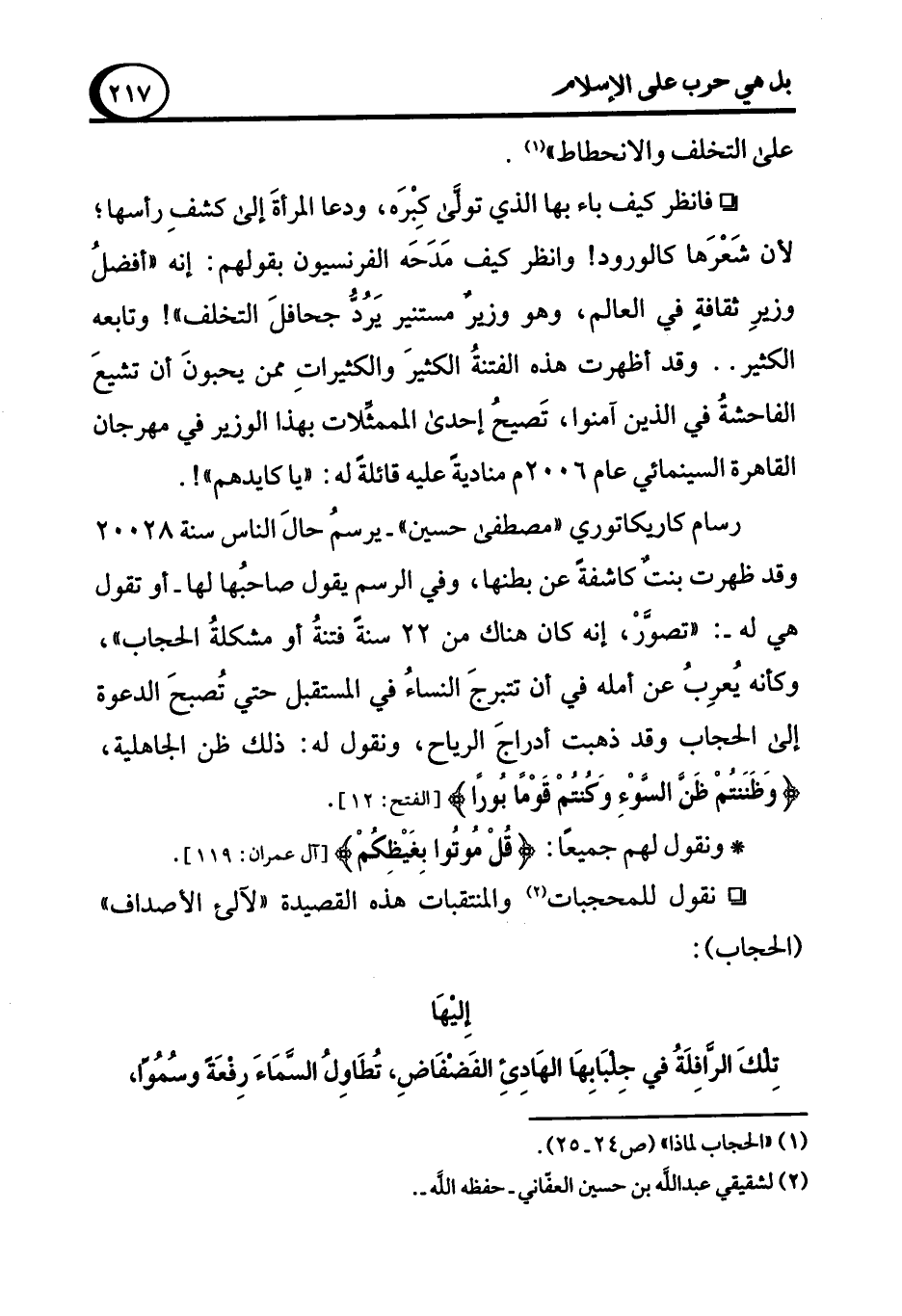 ° نقول للمحجبات (¬2) والمنتقبات هذه القصيدة "لآليء الأصداف" (الحجاب):