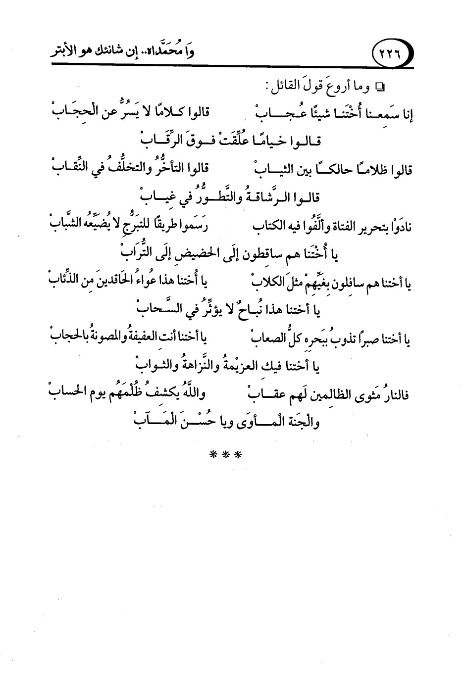 يا أختنا صبرًا تذوبُ ببَحرِه كلُّ الصعابْ ... يا أختنا أنتِ العفيفةُ والمصونةُ بالحجابْ