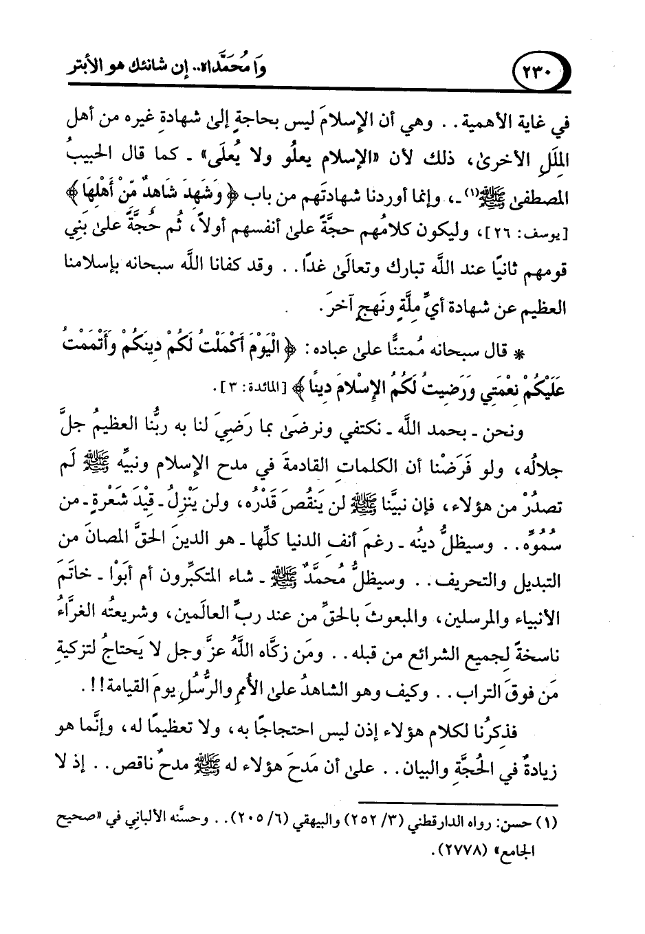 ونحن -بحمد الله- نكتفي ونرضَى بما رَضِيَ لنا به ربُّنا العظيمُ جل جلالُه، ولو فَرَضْنا أن الكلماتِ القادمةَ في مدح الإسلام ونبيه - صلى الله عليه وسلم - لَم تصدُرْ من هؤلاء، فإن نبينا - صلى الله عليه وسلم - لن يَنقُصَ قَدْرُه، ولن يَنْزِلُ -قِيْدَ شَعْرةٍ - من سُمُوِّه .. وسيظل دينُه -رغمَ أنفِ الدنيا كلِّها- هو الدينَ الحقَّ المصانَ من التبديل والتحريف .. وسيظل مُحمَّدٌ - صلى الله عليه وسلم - شاء المتكبِّرون أم أبَوْا- خاتَمَ الأنبياء والمرسلين، والمبعوثَ بالحق من عند رب العالَمين، وشريعته الغراءُ ناسخةً لِجميع الشرائع من قبله .. ومَن زكَّاه اللهُ عز وجل لا يَحتاجُ لتزكيةِ مَن فوقَ التراب .. وكيف وهو الشاهدُ على الأمم والرسل يومَ القيامة!!.