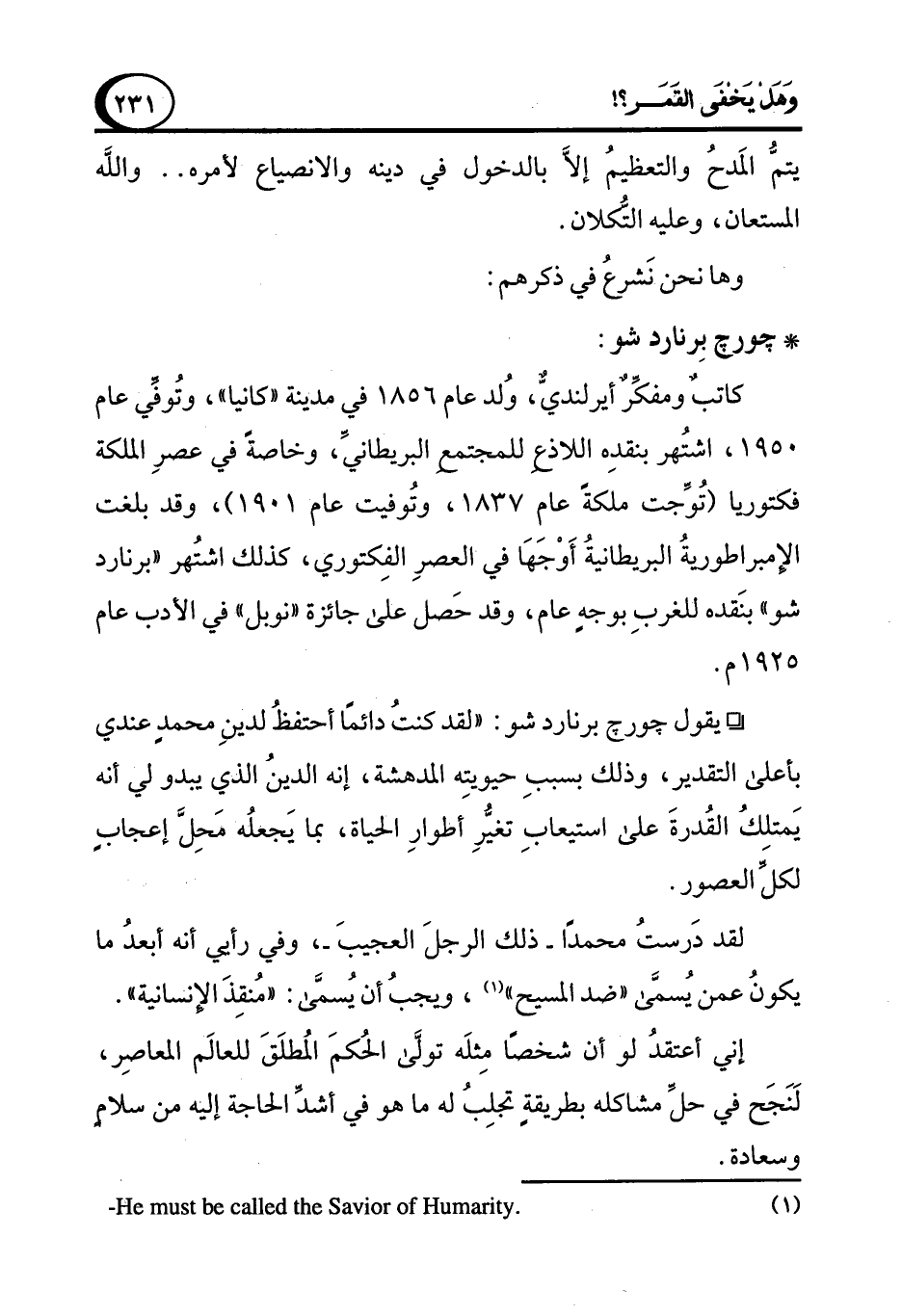 ° يقول جورج برنارد شو: "لقد كنتُ دائمًا أحتفظُ لدينِ محمدٍ عندي بأعلى التقدير، وذلك بسببِ حيويتِه المدهشة، إنه الدينُ الذي يبدو لي أنه يَمتلكُ القُدرةَ على استيعابِ تغيُّرِ أطوارِ الحياة، بما يَجعلُه مَحِلَّ إعجابٍ لكل العصور.