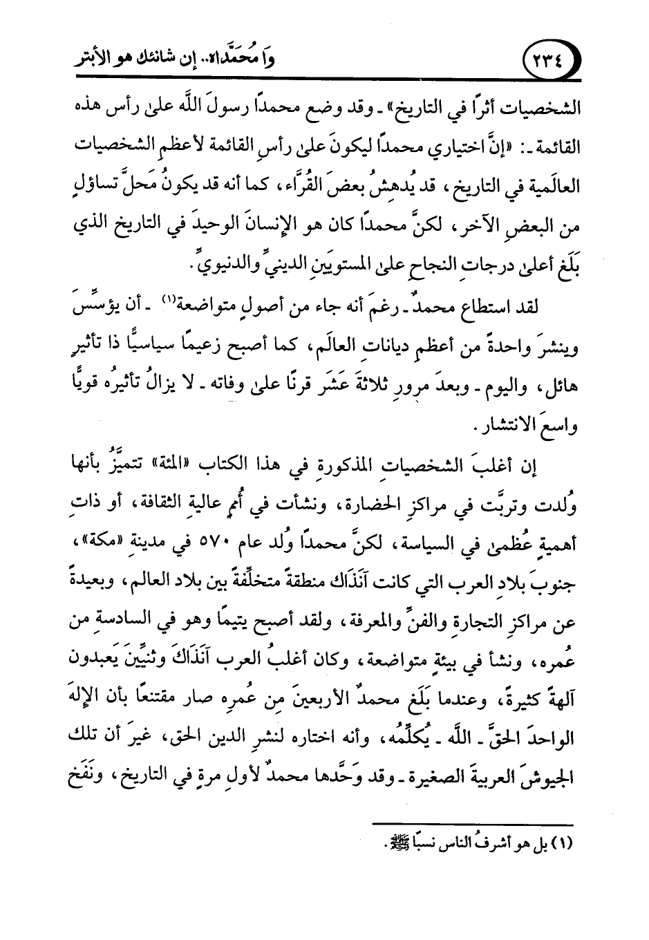 إن أغلبَ الشخصياتِ المذكورةِ في هذا الكتاب "المئة" تتميزُ بأنها وُلدت وتربت في مراكزِ الحضارة، ونشأت في أُممٍ عاليةِ الثقافة، أو ذاتِ أهميةٍ عُظمى في السياسة، لكنَّ محمدًا وُلد عام 570 في مدينةِ "مكة"، جنوبَ بلادِ العرب التي كانت آنَذَاك منطقةً متخلِّفةً بين بلاد العالم، وبعيدةً عن مراكزِ التجارةِ والفنِّ والمعرفة، ولقد أصبح يتيمًا وهو في السادسةِ من عُمره، ونشأ في بيئةٍ متواضعة، وكان أغلبُ العرب آنَذَاكَ وثنيينَ يَعبدون آلهةً كثيرةً، وعندما بَلَغ محمدٌ الأربعينَ مِن عُمرِه صار مقتنعًا بأن الإلهَ الواحدَ الحق -الله- يُكلِّمُه، وأنه اختاره لنشرِ الدين الحق، غيرَ أن تلك الجيوش العربيةَ الصغيرة -وقد وَحَّدها محمدٌ لأولِ مرةٍ في التاريخ، ونَفَخ
