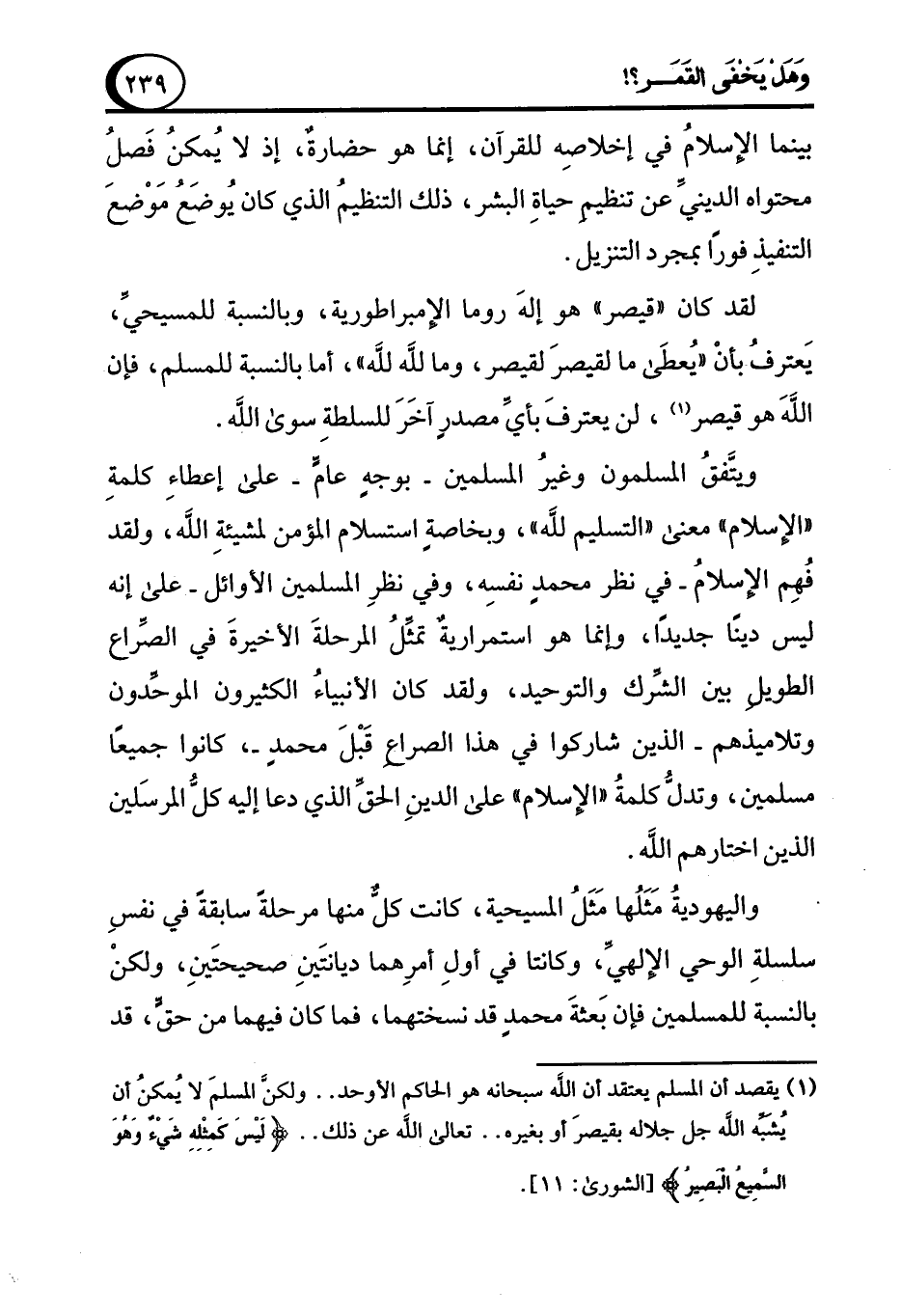 (¬1) يقصد أن المسلم يعتقد أن الله سبحانه هو الحاكم الأوحد .. ولكن المسلمَ لا يُمكنُ أن يُشبه الله جل جلاله بقيصرَ أو بغيره .. تعالى الله عن ذلك .. {لَيْسَ كَمِثْلِهِ شَيْءٌ وَهُوَ السَّمِيعُ الْبَصِيرُ} [الشورى: 11].