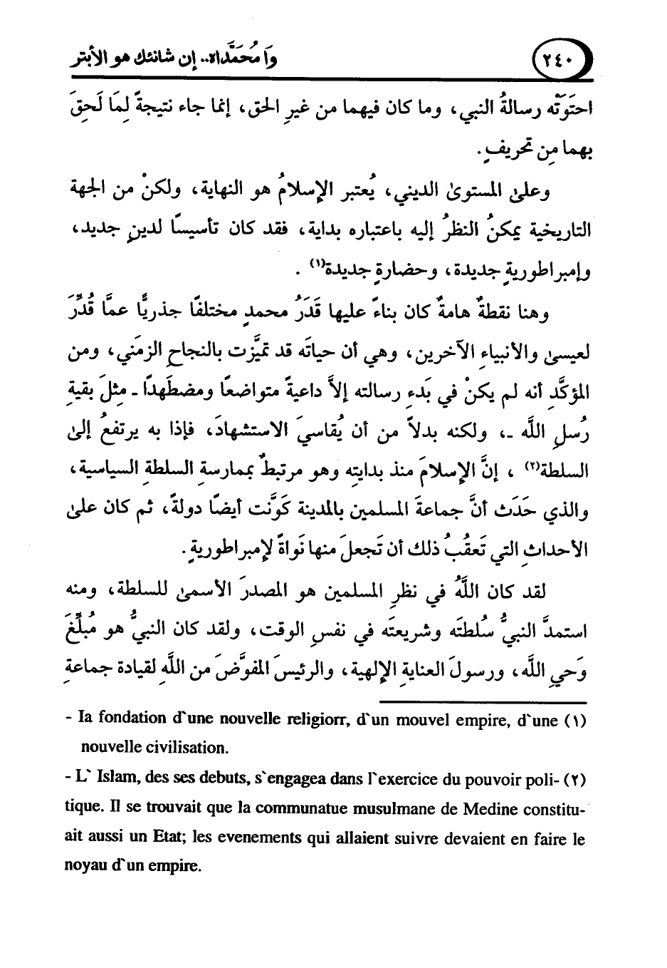 وهنا نقطة هامة كان بناءً عليها قَدَرُ محمدٍ مختلفًا جذريًّا عما قُدِّرَ لعيسى والأنبياءِ الآخرين، وهي أن حياتَه قد تميزت بالنجاح الزمَني، ومن المؤكَّدِ أنه لم يكنْ في بَدءِ رسالته إلاَّ داعيةً متواضعًا ومضطَهدًا -مِثلَ بقيةِ رُسل الله-، ولكنه بدلاً من أن يُقاسيَ الاستشهادَ، فإذا به يرتفع إلى السلطة (¬2)، إن الإسلامَ منذ بدايتِه وهو مرتبطٌ بممارسةِ السلطةِ السياسية، والذي حَدَث أن جماعةَ المسلمين بالمدينة كَوَّنت أيضًا دولةَ، ثم كان على الأحداثِ التي تَعقُبُ ذلك أن تَجعلَ منها نَواةَ لإمبراطوريةٍ.