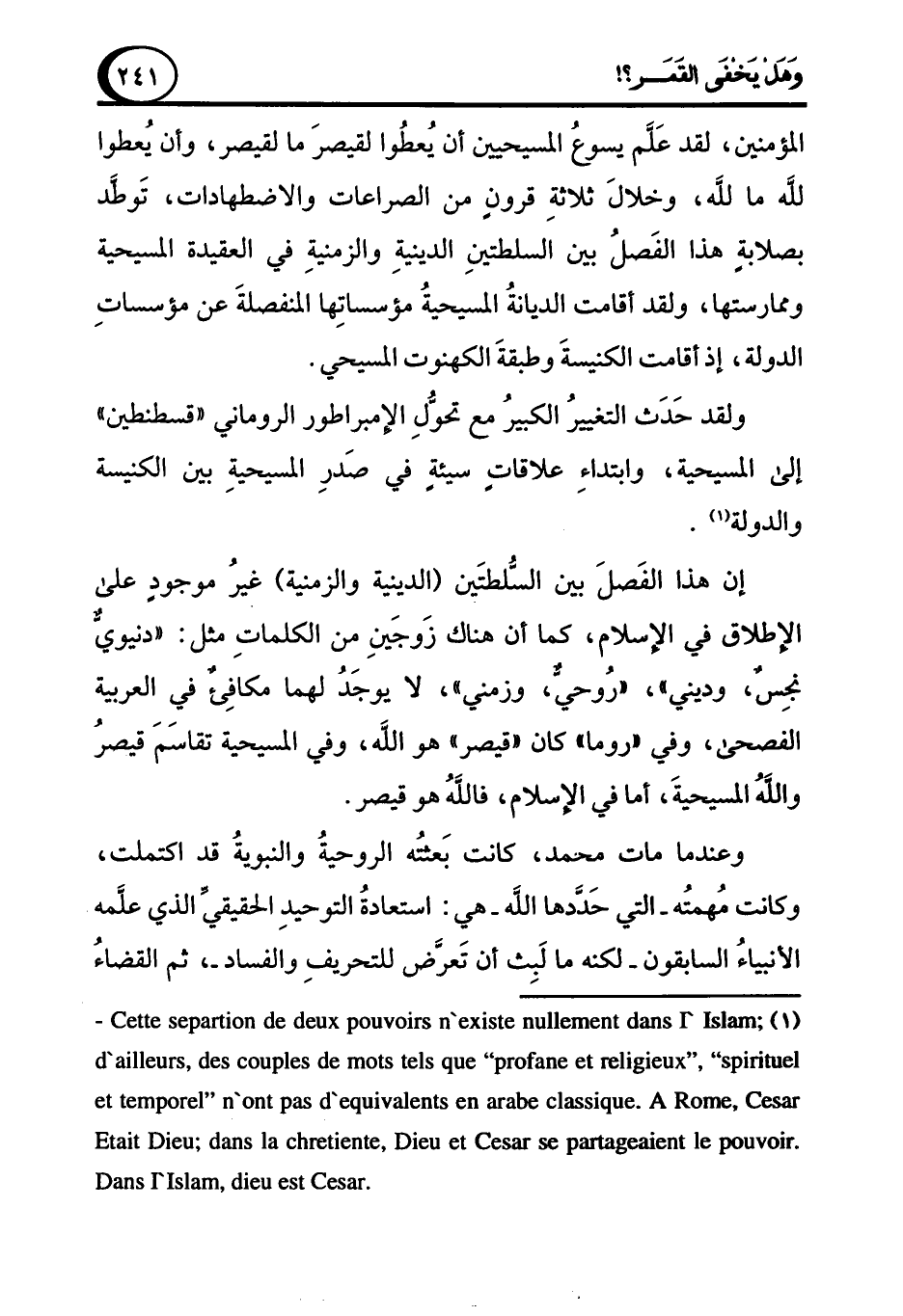 (¬1) cette separation de deux pouvoirs n'existe nullement dans L'Islam; d'ailleurs, des couples de mots tels que "profance et religieux","spirituel et temporel" n'ont pas d'equivalents en arabe classique. A Rome, Cesar Etait Dieu; dans la chretiente, Diue et Cesar se partageaient le pouvoir. Dans L'Islam, diue est Cesar.