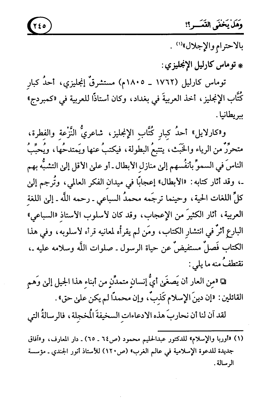 و"كارلايل" أحدُ كِبارِ كُتَّابِ الإنجليز، شاعريُّ النَّزْعةِ والفِطرة، متحرِّرٌ من الرياء والخَبَث، يتتبعُ البطولة، فيكتبُ عنها ويَمتدحُها، ويُحبِّبُ الناسَ في السموِّ بأنفُسهم إلى منازلِ الأبطال -أو على الأقل إلى التشبُّه بهم-، وقد أثار كتابه: "الأبطال" إعجابًا في ميدانِ الفكر العالمي، وتُرجم إلى كل اللغات الحية، وحينما ترجَمه محمدُ السباعي -رحمه الله- إلى اللغةِ العربية، أثار الكثيرَ من الإعجاب، وقد كان الأسلوب الأستاذِ "السباعي" البارع أثر في انتشارِ الكتاب، ومَن لم يقرأْه لمعانيه قرأه لأسلوبه، وفي هذا الكتاب فَصلٌ مستفيضٌ عن حياة الرسول -صلوات الله وسلامه عليه-، نقتطفُ منه ما يلي: