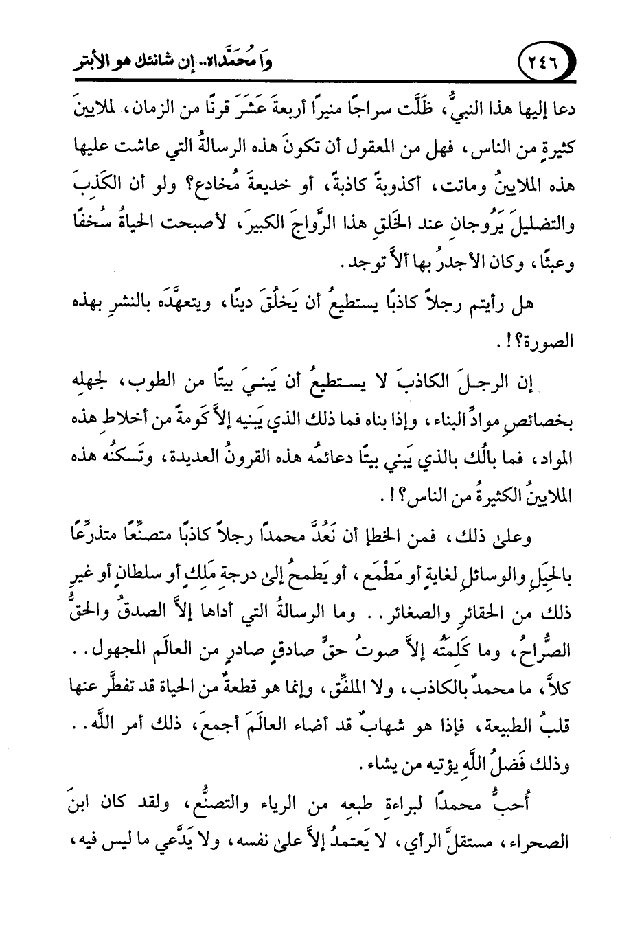دعا إليها هذا النبي، ظَلَّت سراجًا منيرًا أربعةَ عَشَرَ قرنًا من الزمان، لملايينَ كثيرةٍ من الناس، فهل من المعقول أن تكونَ هذه الرسالةُ التي عاشت عليها هذه الملايينُ وماتت، أكذوبةَ كاذبةً، أو خديعةَ مُخادع؟ ولو أن الكَذِبَ والتضليلَ يَرُوجانِ عند الخَلقِ هذا الرَّواجَ الكبيرَ، لأصبحت الحياةُ سُخفًا وعبثًا، وكان الأجدرُ بها ألاَّ توجد.