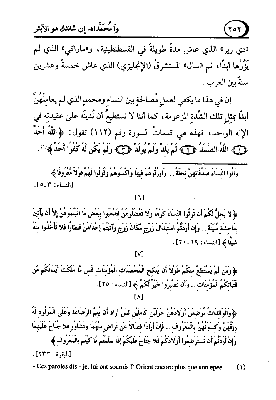 إن في هذا ما يكفي لعمل مصالحةٍ بين النساء ومحمدِ الذي لم يعامِلْهُنَّ أبدًا بمثِل تلك الشِّدةِ المزعومة، كما أننا لا نستطيعُ أن ندينَه على عقيدتِه في الإله الواحد، فهذه هي كلماتُ السورة رقم (112) تقول: {اللَّهُ أَحَدٌ (1) اللَّهُ الصَّمَدُ (2) لَمْ يَلِدْ وَلَمْ يُولَدْ (3) وَلَمْ يَكُنْ لَهُ كُفُوًا أَحَدٌ (4)} (¬1).