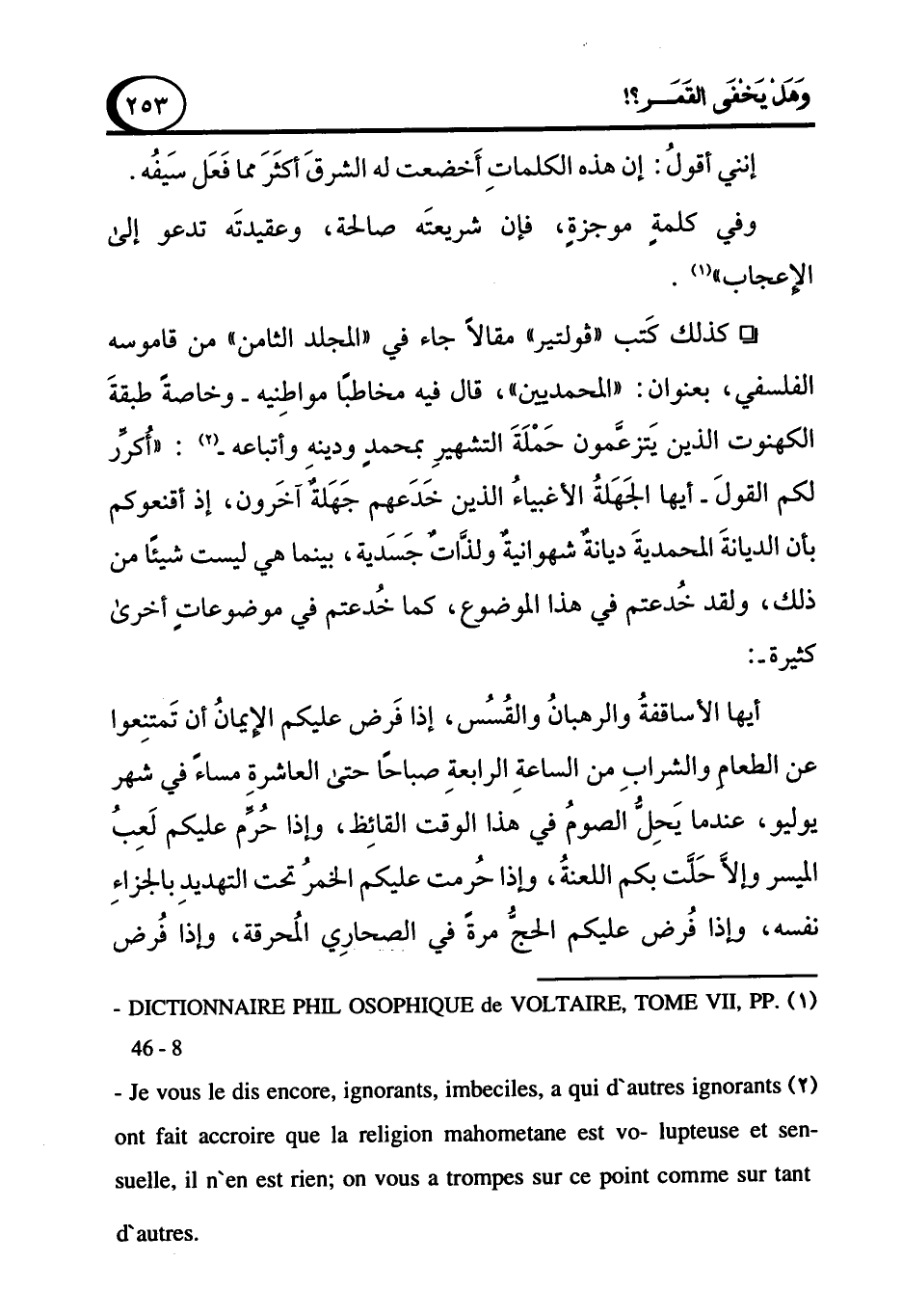 ° كذلك كَتب "فولتير" مقالاً جاء في "المجلد الثامن" من قاموسه الفلسفي، بعنوان: "المحمديين"، قال فيه مخاطبًا مواطِنيه -وخاصةً طبقةَ الكهنوت الذين يَتزعَّمون حَمْلَةَ التشهيرِ بمحمدٍ ودينه وأتباعه (¬2): "أُكرِّر لكم القولَ -أيها الجَهَلةُ الأغبياءُ الذين خَدَعهم جَهَلةٌ آخَرون، إذ أقنعوكم بأن الديانةَ المحمديةَ ديانةٌ شهوانيةٌ ولذاتٌ جَسَدية، بينما هي ليست شيئًا من ذلك، ولقد خُدعتم في هذا الموضوع، كما خُدعتم في موضوعاتٍ أخرى كثيرة-: