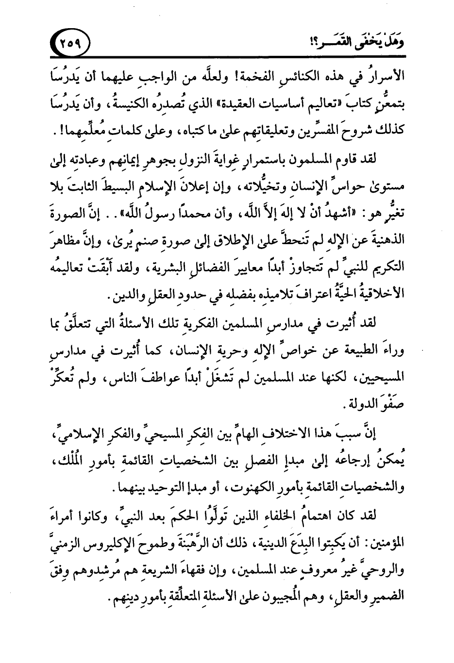 الأسرارُ في هذه الكنائسِ الفخمة! ولعلَّه من الواجب عليهما أن يَدرُسَا بتمعن كتابَ "تعاليم أساسيات العقيدة" الذي تُصدِرُه الكنيسةُ، وأن يَدرُسَا كذلك شروحَ المفسرين وتعليقاتِهم على ما كتباه، وعلى كلماتِ مُعلِّمِهما!.