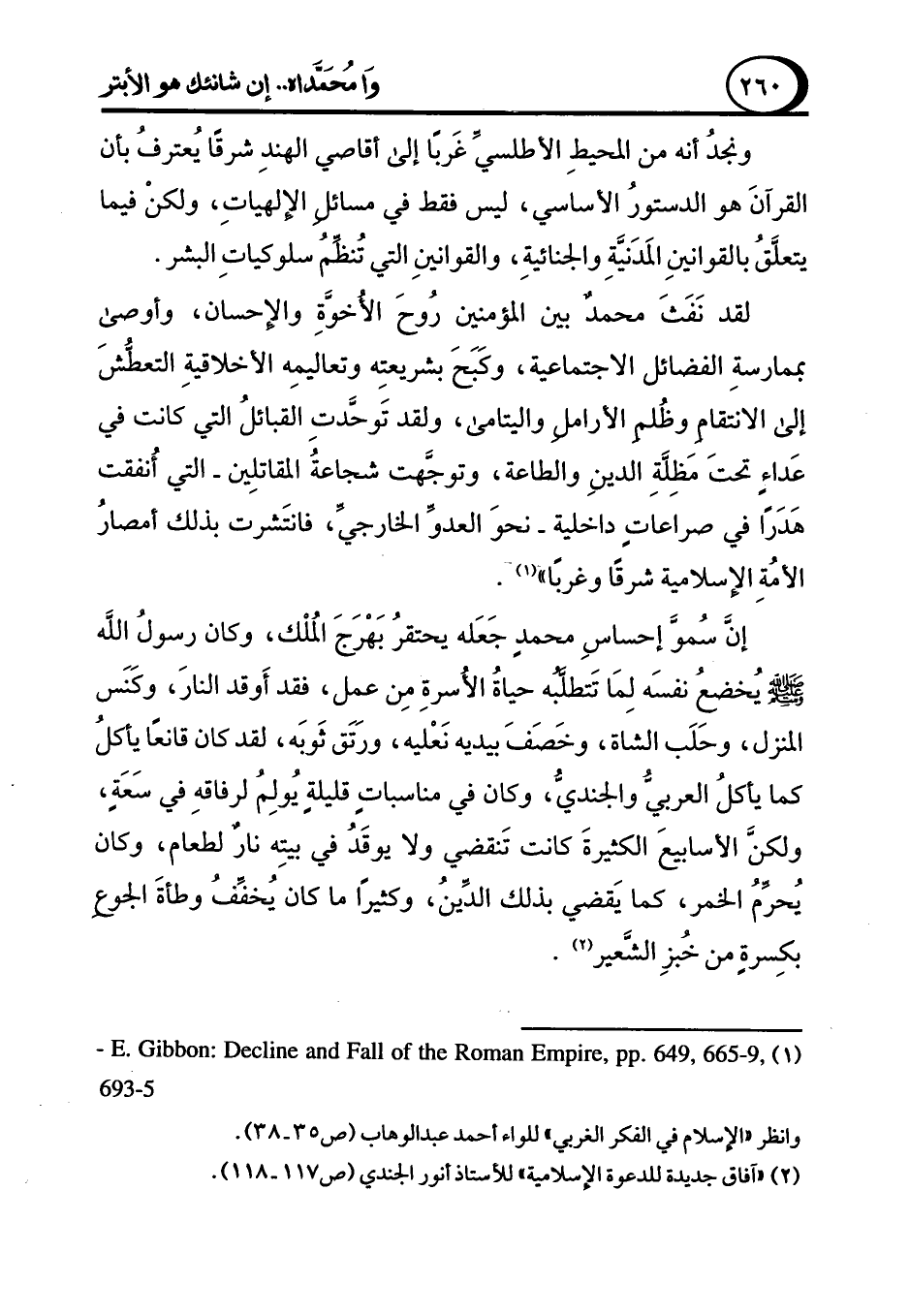 ونجد أنه من المحيطِ الأطلسي غَربًا إلى أقاصي الهندِ شرقًا يعترف بأن القرآنَ هو الدستور الأساسي، ليس فقط في مسائل الإلهياتِ، ولكنْ فيما يتعلق بالقوانينِ المَدَنيةِ والجنائيةِ، والقوانينِ التي تُنظم سلوكياتِ البشر.