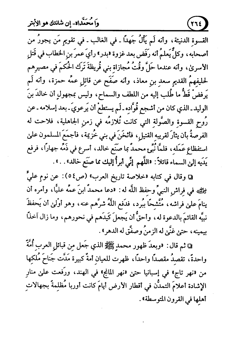 ° ثم قال: "وبعدَ ظهور محمدِ - صلى الله عليه وسلم - الذي جَعل مِن قبائل العربِ أُمة واحدةً، تقصِدُ مقصدًا واحدًا، ظهرت للعيانِ أمة كبيرة مَدَّت جَناحَ مُلكِها من "نهر تاج" في إسبانيا حتى (نهر المانج) في الهند، ورَفعت على منارِ الإشادة أعلامَ التمدن في أقطار الأرض أيامَ كانت أوربا مُظلِمةً بجهالاتِ أهلِها في القرون المتوسطة".