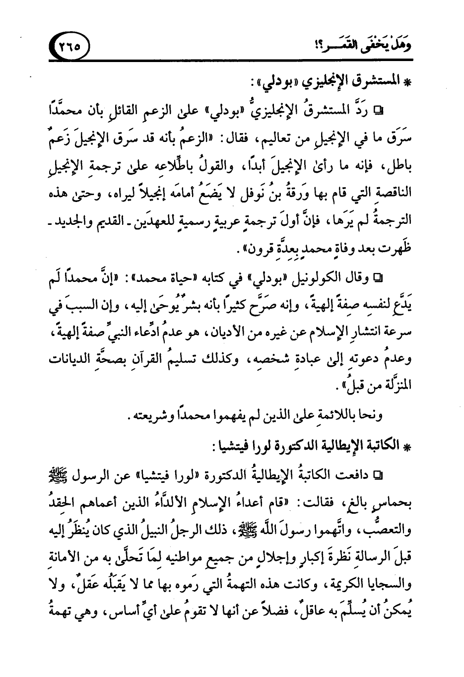 ° وقال الكولونيل "بودلي" في كتابه "حياة محمد": "إن محمدًا لَم يَدع لنفسِه صِفةً إلهيةً، وإنه صَرَّح كثيرًا بأنه بشر يُوحَى إليه، وإن السببَ في سرعة انتشارِ الإسلام عن غيره من الأديان، هو عدمُ ادعاء النبي صفةً إلهيةً، وعدمُ دعوتهِ إلى عبادةِ شخصِه، وكذلك تسليمُ القرآنِ بصحَّةِ الديانات المنزلة من قبلُ".