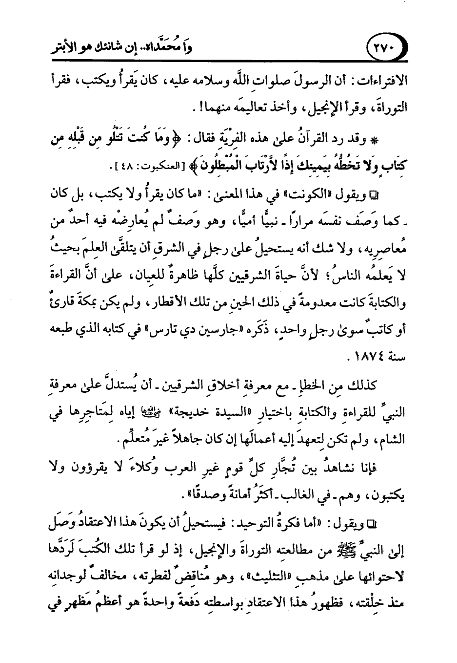 * وقد رد القرآن على هذه الفِريَةِ فقال: {وَمَا كنتَ تَتْلُو مِن قَبْلِهِ مِن كِتَابٍ وَلا تَخُطُّهُ بِيَمِيِنك إِذًا لاَّرْتَابَ الْمُبْطِلُونَ} [العنكبوت: 48].