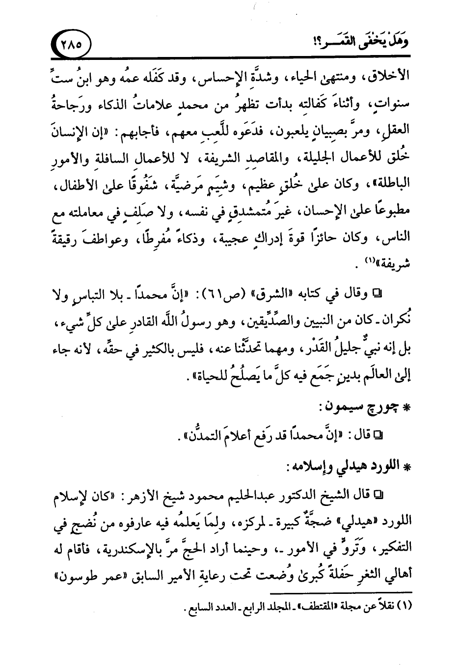 ° وقال في كتابه "الشرق" (ص 61): "إنَّ محمدًا -بلا التباس ولا نُكران- كان من النبيين والصِّدِّيقين، وهو رسولُ الله القادرِ على كلِّ شيء، بل إنه نبى جليلُ القَدْر، ومهما تحدثنا عنه، فليس بالكثير في حقه، لأنه جاء إلى العالَم بدينٍ جَمَع فيه كل ما يَصلُحُ للحياة".