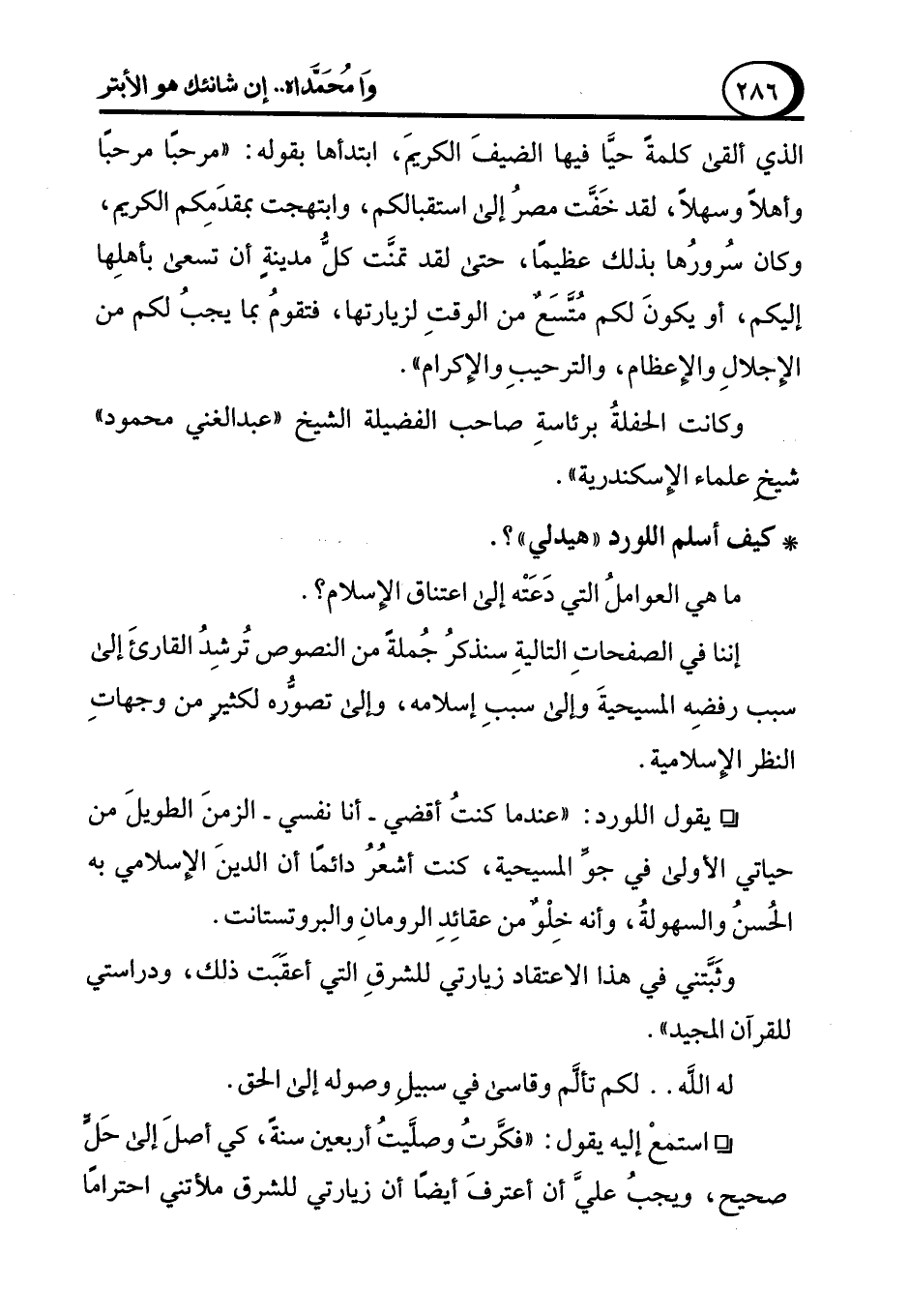 ° يقول اللورد: "عندما كنتُ أقضي -أنا نفسي- الزمنَ الطويلَ من حياتي الأولى في جو المسيحية، كنت أشعُرُ دائمًا أن الدينَ الإسلامي به الحُسنُ والسهولةُ، وأنه خِلْوٌ من عقائِدِ الرومانِ والبروتستانت.