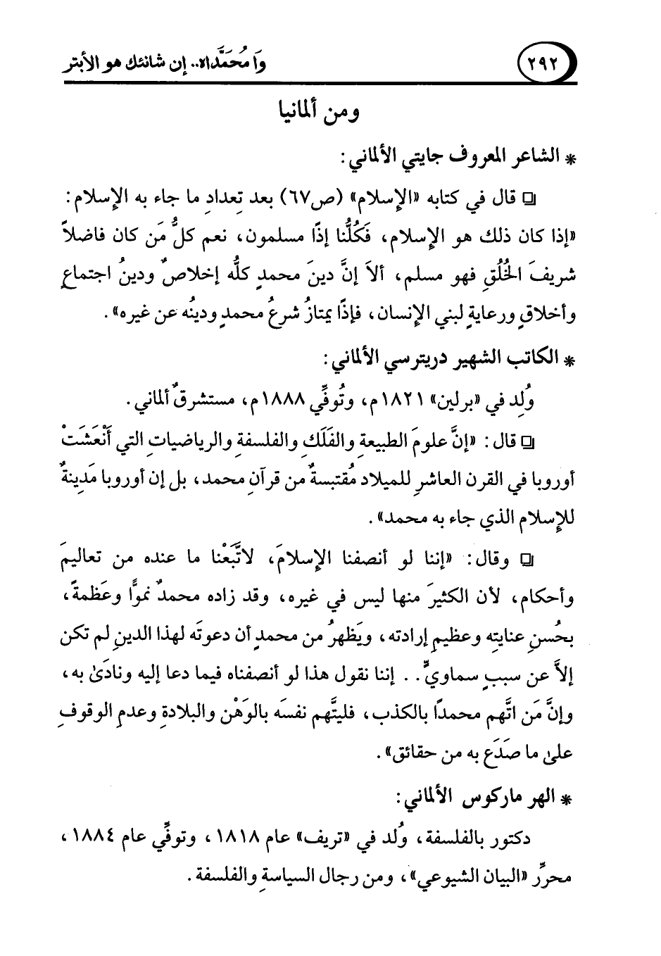 ° قال في كتابه "الإسلام" (ص 67) بعد تِعدادِ ما جاء به الإسلام: "إذا كان ذلك هو الإسلام، فَكُلُّنا إذًا مسلمون، نعم كلُّ مَن كان فاضلاً شريفَ الخُلُقِ فهو مسلم، ألاَ إنَّ دينَ محمدٍ كلُّه إخلاصٌ ودين اجتماع وأخلاقٍ ورعايةٍ لبني الإنسان، فإذًا يمتازُ شرعُ محمدٍ ودينُه عن غيره".