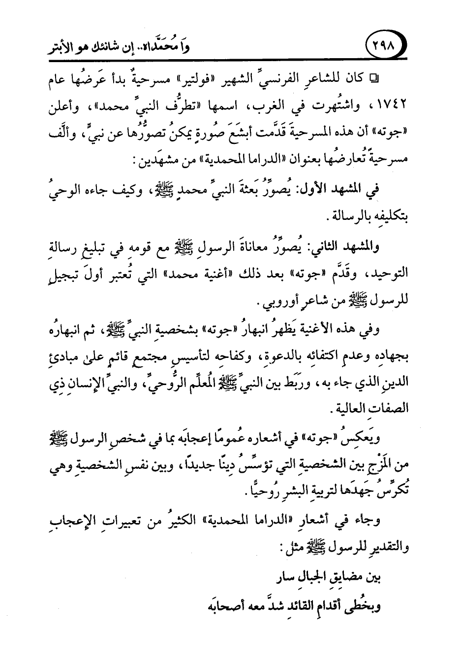 ° كان للشاعرِ الفرنسيِّ الشهير "فولتير" مسرحية بدأ عَرضُها عام 1742، واشتُهرت في الغرب، اسمها "تطرف النبيِّ محمد"، وأعلن "جوته" أن هذه المسرحيةَ قَدَّمت أبشَعَ صُورةٍ يمكنُ تصوُّرُها عن نبيٍّ، وألَف مسرحيةً تُعارضُها بعنوان "الدراما المحمدية" من مشهَدين:
