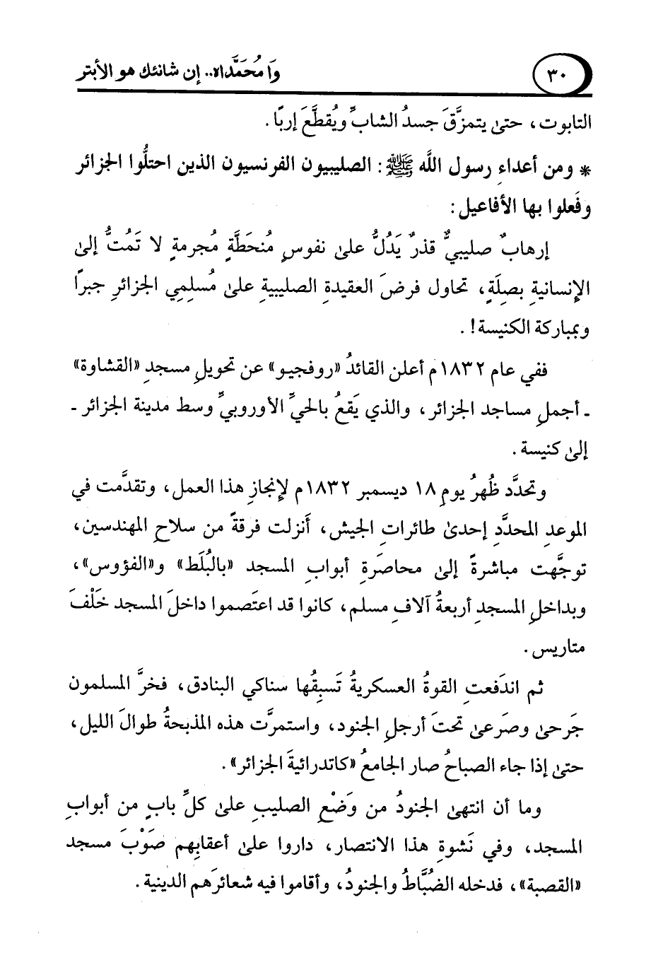 * ومن أعداءِ رسول الله - صلى الله عليه وسلم -: الصليبيون الفرنسيون الذين احتلُّوا الجزائر وفَعلوا بها الأفاعيل: