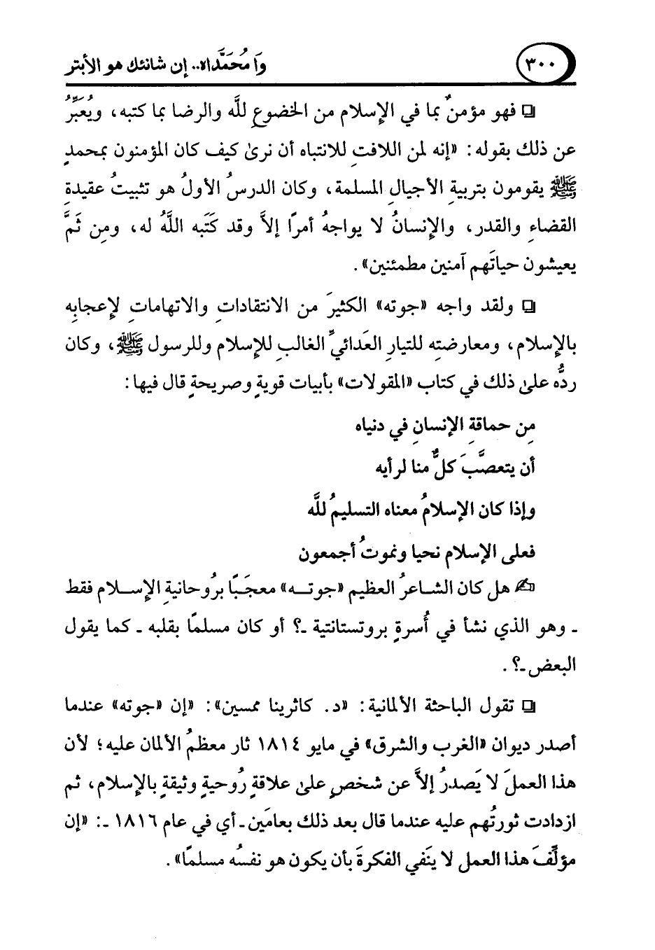 ° ولقد واجه "جوته" الكثيرَ من الانتقاداتِ والاتهاماتِ لإعجابِه بالإسلام، ومعارضتِه للتيارِ العَدائي الغالبِ للإسلام وللرسول - صلى الله عليه وسلم -، وكان ردُّه على ذلك في كتاب "المقولات" بأبيات قويةٍ وصريحةٍ قال فيها: