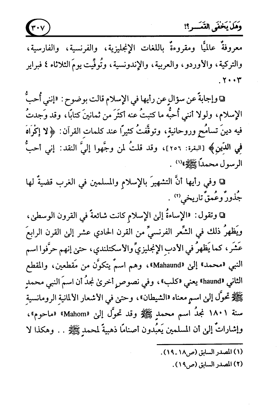 ° وتقول: "الإساءةُ إلى الإسلام كانت شائعةً في القرون الوسطى، ويَظهرُ ذلك في الشعر الفرنسي من القرن الحادي عشر إلى القرن الرابعَ عَشَر، كما يَظهرُ في الأدبِ الإنجليزي والأسكتلندي، حتى إنهم حرَّفوا اسم النبي "محمد" إلى " Mahaund" وهم اسمٌ يتكوَّن من مَقطعين، والمقطع الثاني " haund" يعني "كلب"، وفي نصوص أخرى نجدُ أن اسمَ النبي محمدٍ - صلى الله عليه وسلم - تحول إلى اسم معناه "الشيطان"، وحتى في الأشعار الألمانيةِ الرومانسيةِ سنة 1801 نجدُ اسم محمدٍ - صلى الله عليه وسلم - وقد تحول إلى " Mahom " " ماحوم"، وإشاراتٌ إلى أن المسلمين يَعبُدون أصنامًا ذهبيةً لمحمدٍ - صلى الله عليه وسلم - .. وهكذا لا