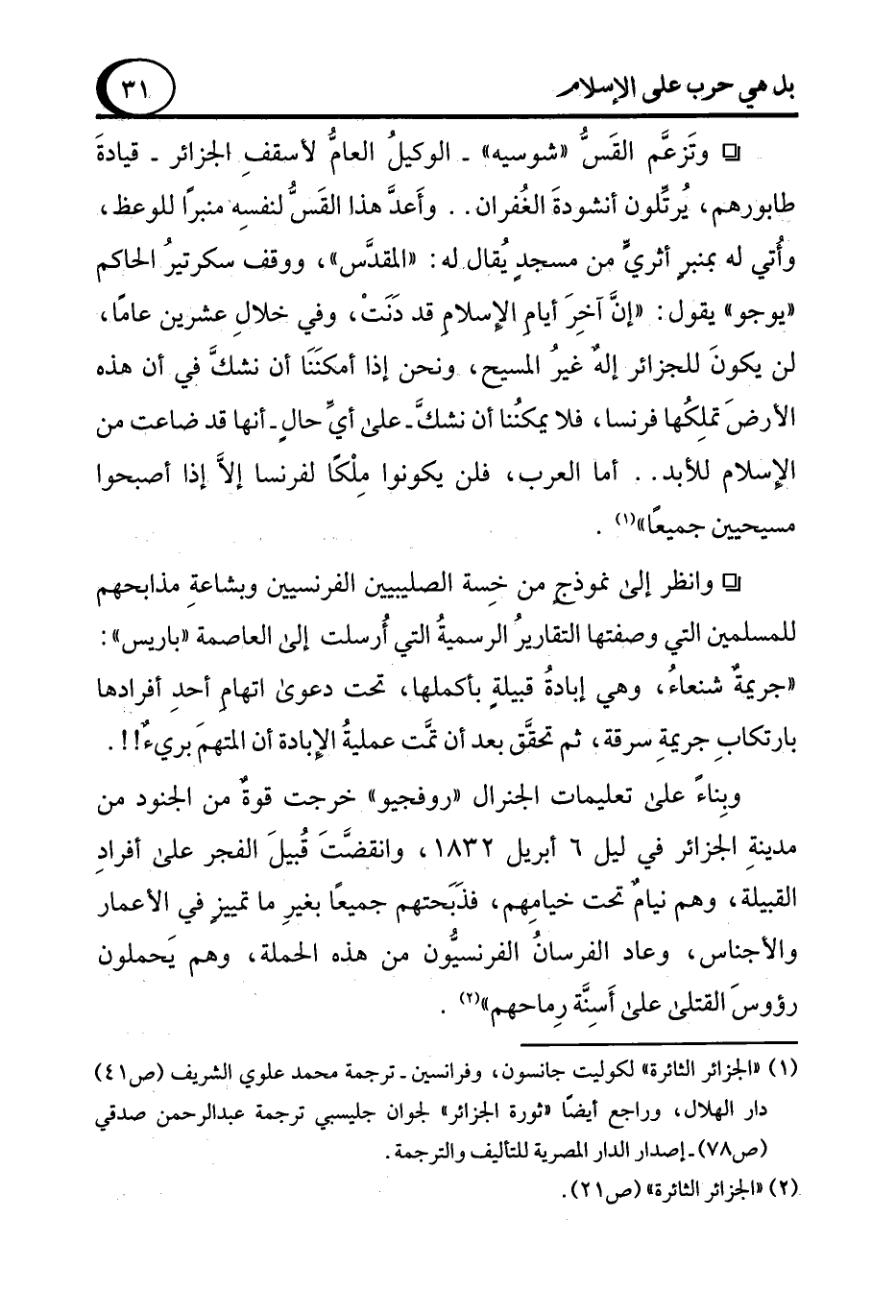 ° وانظر إلى نموذج من خِسة الصليبيين الفرنسيين وبشاعةِ مذابحهم للمسلمين التي وصفتها التقاريرُ الرسميةُ التي أُرسلت إلى العاصمة "باريس": "جريمةٌ شنعاءُ، وهي إبادةُ قبيلةٍ بأكملها، تحت دعوى اتهام أحدِ أفرادها بارتكابِ جريمةِ سرقة، ثم تحقَّق بعد أن تمَّت عمليةُ الإبادة أن المتهمَ بريءٌ!!.