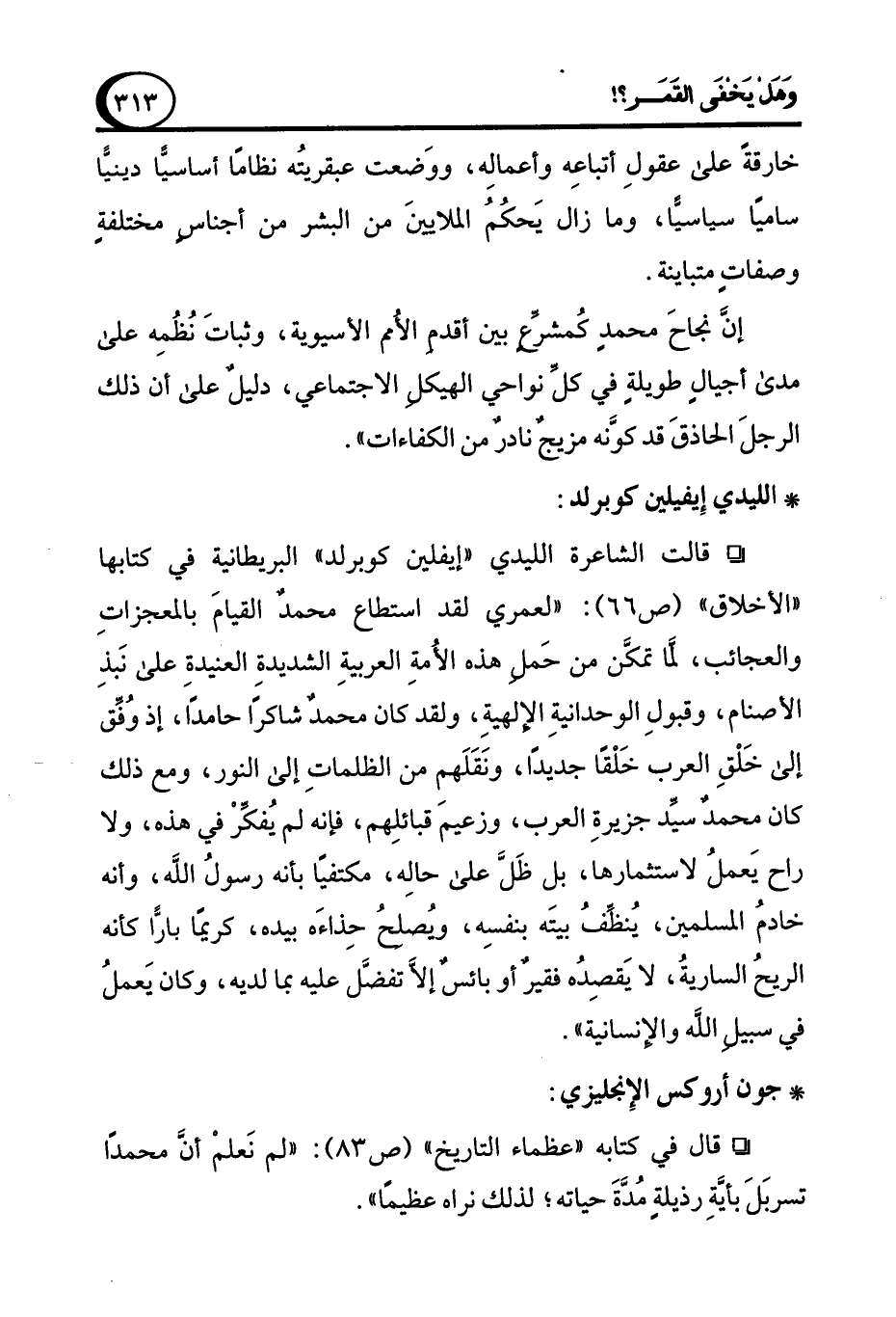° قال في كتابه "عظماء التاريخ" (ص 83): "لم نَعلمْ أن محمدًا تسربَلَ بأيَّةِ رذيلةٍ مُدَّةَ حياته؛ لذلك نراه عظيمًا".