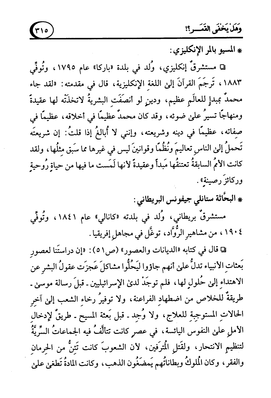 ° قال في كتابه "الديانات والعصور" (ص 51): "إن دراستَنا لعصورِ بَعثاتِ الأنبياء تدل على أنهم جاؤوا ليَحُلُّوا مشاكلَ عَجزَت عقولُ البشرِ عن الاهتداءِ إلى حلولٍ لها، فلم توجَدْ لدى الإسرائيليين -قبلَ رسالة موسى- طريقةٌ للخلاص من اضطهادِ الفراعنة، ولا توفيرُ رخاءِ الشعب إلى آخِرِ الحالاتِ المستوجِبةِ للعلاج، ولا وُجِد -قبل بَعثة المسيح- طريقٌ لإدخالِ الأمل على النفوس اليائسة، في عصرٍ كانت تتألَّفُ فيه الجماعاتُ السِّريَّةُ لتنظيم الانتحار، ولقَتل المُترَفين، لأن الشعوبَ كانت تَئِنُّ من الحِرمانِ والفقر، وكان المُلوكُ وبطاناتُهم يَمضَغُون الذهب، وكانت المادةُ تَطغى على