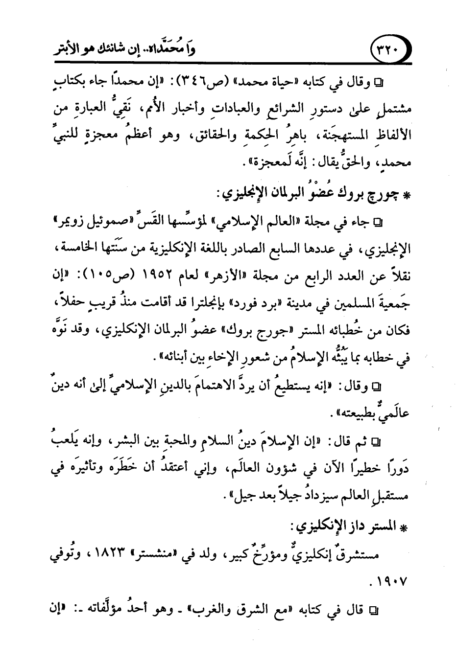 ° ثم قال: "إن الإسلامَ دينُ السلام والمحبةِ بين البشر، وإنه يَلعبُ دَورًا خطيرًا الآن في شؤون العالَم، وإني أعتقدُ أن خَطَرَه وتأثيرَه في مستقبل العالم سيزدادُ جيلاً بعد جيل".