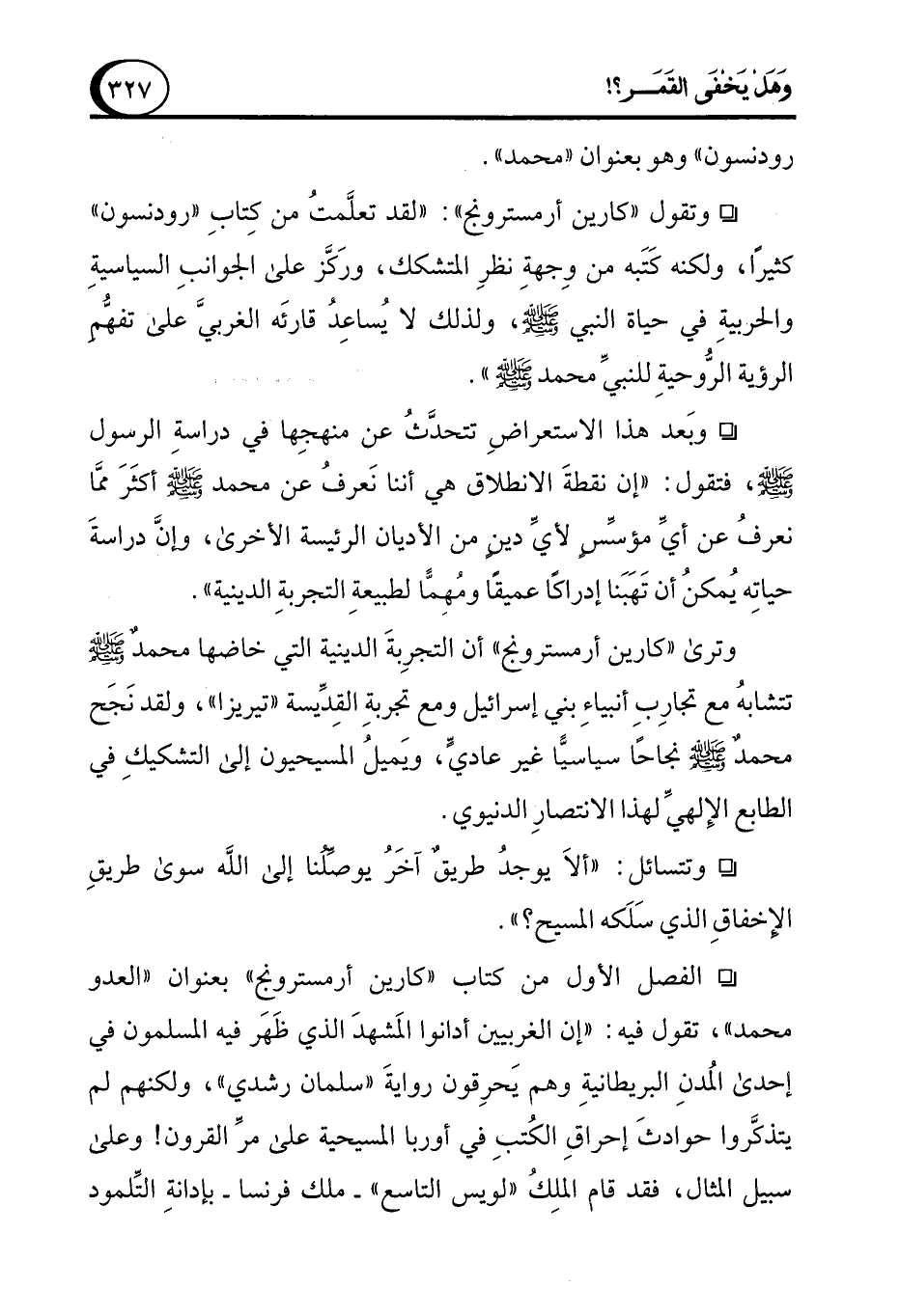° وتقول "كارين أرمسترونج": "لقد تعلَّمتُ من كِتابِ "رودنسون" كثيراً، ولكنه كَتَبه من وِجهةِ نظرِ المتشكك، ورَكَّز على الجوانبِ السياسيةِ والحربيةِ في حياة النبي - صلى الله عليه وسلم -، ولذلك لا يُساعِدُ قارئَه الغربيَّ على تفهُّمِ الرؤية الرُّوحيةِ للنبيِّ محمد - صلى الله عليه وسلم -".