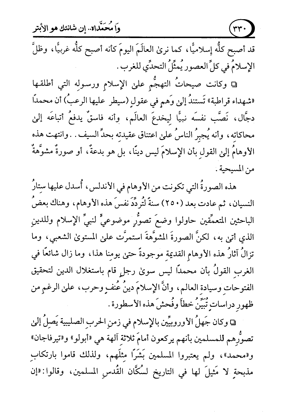 قد أصبح كلُّه إِسلاميًّا، كما نرى العالَمَ اليومَ كأنه أصبح كلُّه غربيًّا، وظلَّ الإسلامُ في كلِّ العصور يُمثِّلُ التحدِّي للغرب.