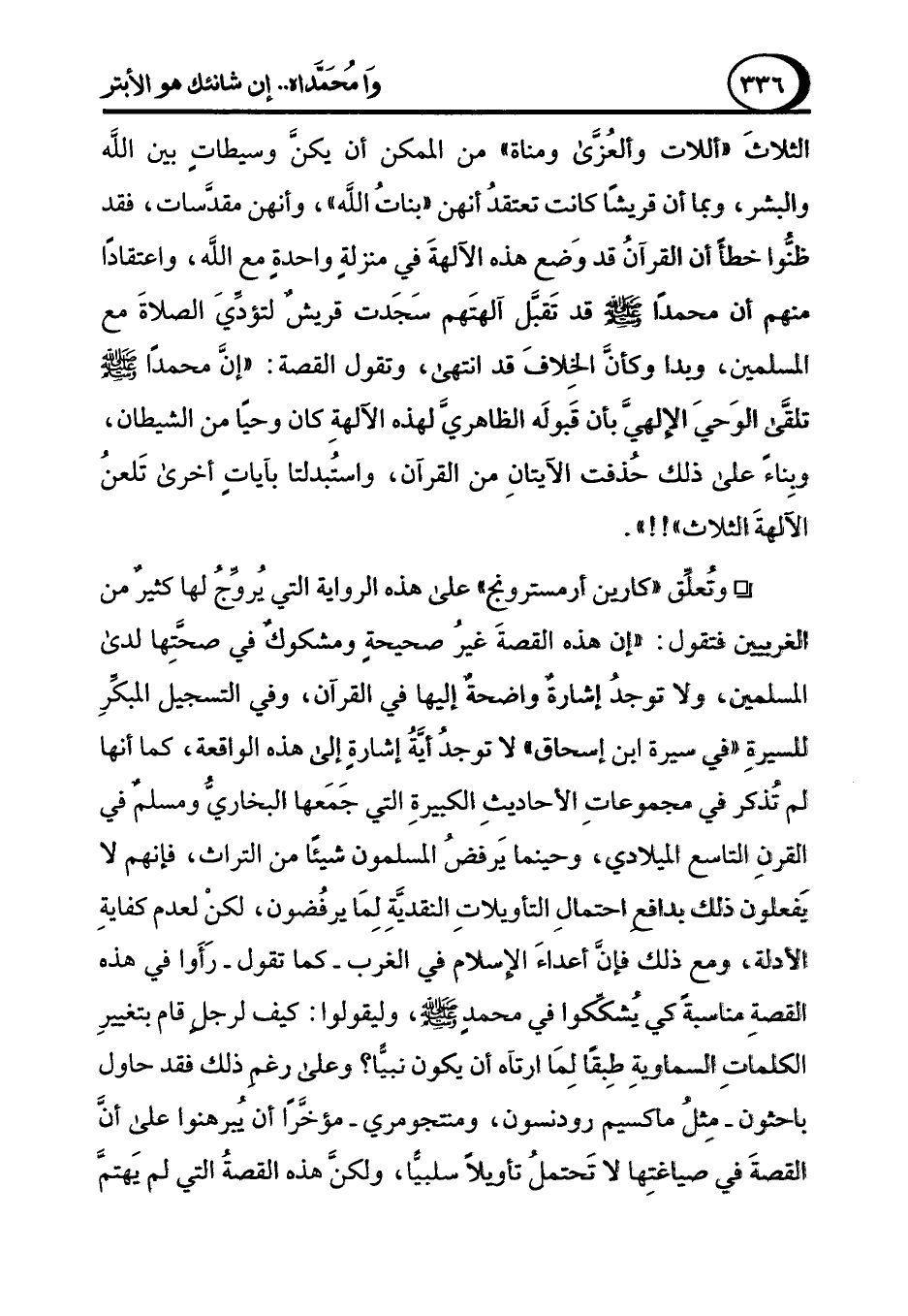 ° وتُعلَّق "كارين أرمسترونج" على هذه الرواية التي يُروِّجُ لها كثيرٌ من الغربيين فتقول: "إن هذه القصةَ غيرُ صحيحةٍ ومشكوكٌ في صحَّتِها لدى المسلمين، ولا توجدُ إشارةٌ واضحةٌ إليها في القرآن، وفي التسجيل المبكِّرِ للسيرةِ "في سيرة ابن إسحاق" لا توجدُ أيَّةُ إشارةٍ إلى هذه الواقعة، كما أنها لم تُذكر في مجموعاتِ الأحاديثِ الكييرةِ التي جَمَعها البخاريُّ ومسلمٌ في القرنِ التاسع الميلادى، وحينما يَرفضُ المسلمون شيئًا من التراث، فإنهم لا يفعلون ذلك بدافعِ احتمال التأويلاتِ النقديَّةِ لِمَا يرفُضون، لكنْ لعدم كفايةِ الأدلة، ومع ذلك فإنَّ أعداءَ الإسلام في الغرب -كما تقول- رَأَوا في هذه القصةِ مناسبةً كي يُشككوا في محمدٍ - صلى الله عليه وسلم -، وليقولوا: كيف لرجلٍ قام بتغييرِ الكلماتِ السماويةِ طِبقًا لِمَا ارتآه أن يكون نبيًّا؟ وعلى رغمِ ذلك فقد حاول باحثون -مِثلُ ماكسيم رودنسون، ومنتجومري- مؤخَّرًا أن يُبرهنوا على أنَّ القصةَ في صياغتِها لا تَحتملُ تأويلاً سلبيًّا، ولكنَّ هذه القصةُ التي لم يَهتمَّ