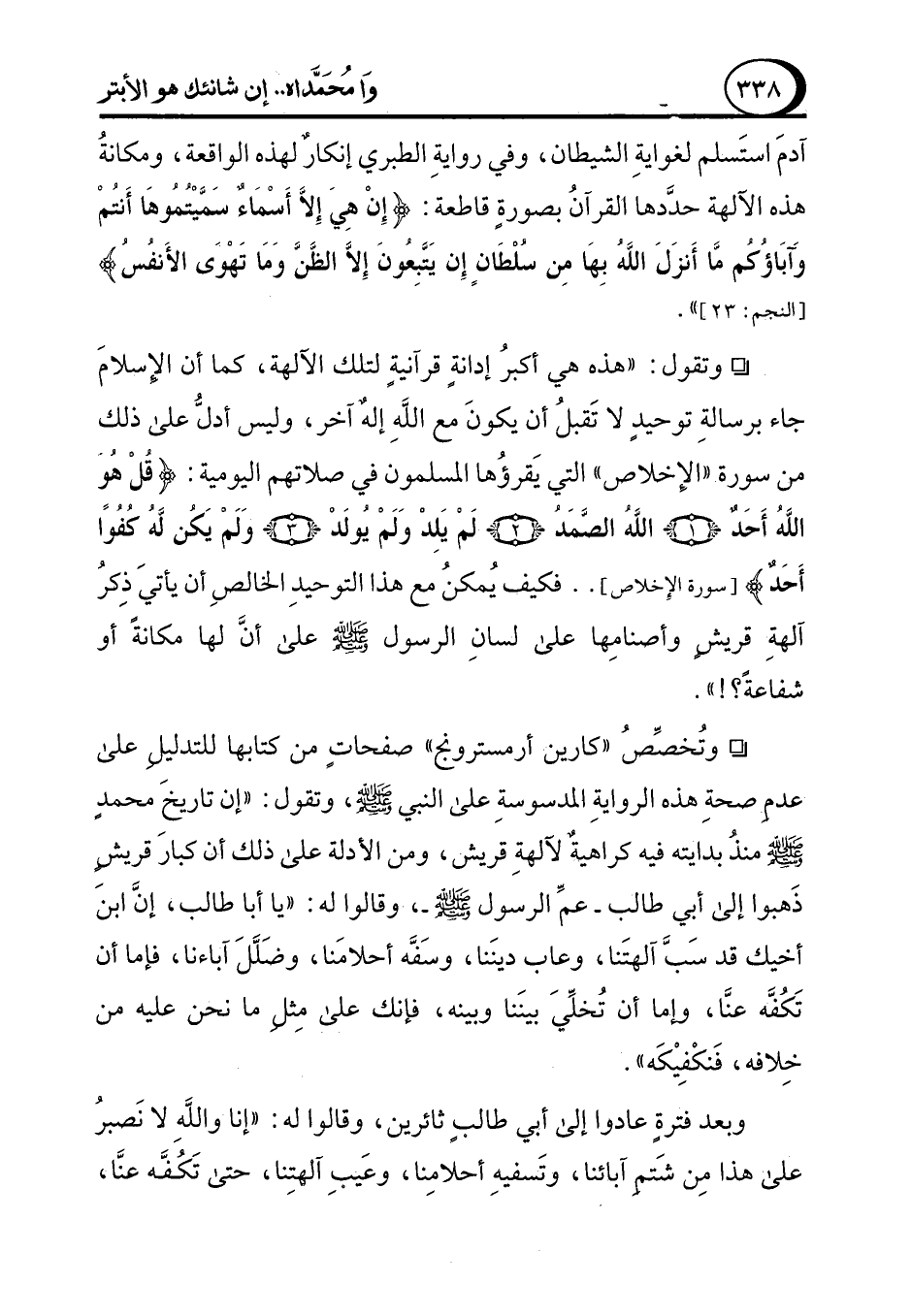 ° وتُخصِّصُ "كارين أرمسترونج" صفحاتٍ من كتابها للتدليلِ على عدمِ صحةِ هذه الروايةِ المدسوسةِ على النبي - صلى الله عليه وسلم -، وتقول: "إن تاريخَ محمدٍ - صلى الله عليه وسلم - منذُ بدايته فيه كراهيةٌ لآلهةِ قريش، ومن الأدلة على ذلك أن كبارَ قريشٍ ذَهبوا إلى أبي طالب -عمِّ الرسول - صلى الله عليه وسلم -، وقالوا له: "يا أبا طالب، إنَّ ابنَ أخيك قد سَبَّ آلهتَنا، وعاب دينَنا، وسَفَّه أحلامَنا، وضَلَّلَ آباءنا، فإما أن تَكُفَّه عنَّا، وإما أن تُخلِّيَ بينَنا وبينه، فإنك على مِثلِ ما نحن عليه من خِلافه، فَنكْفِيْكَه".