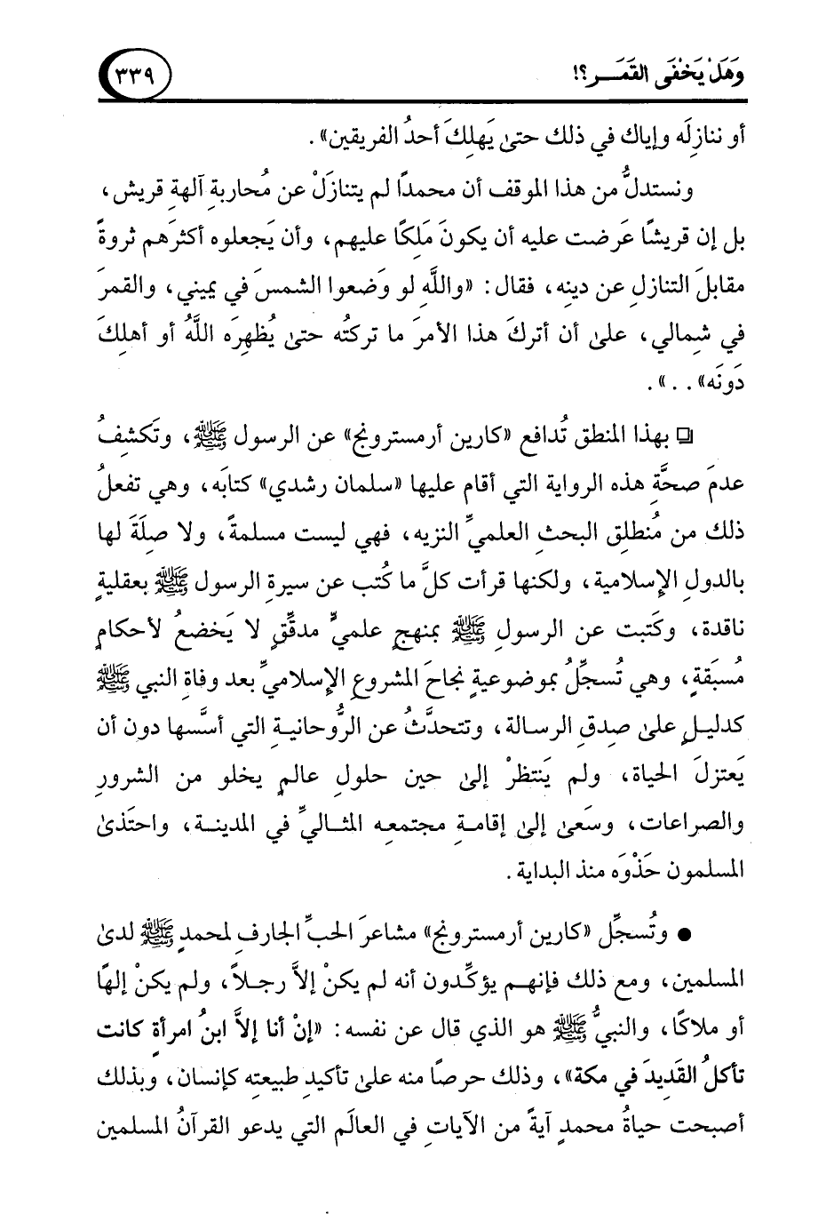° بهذا المنطق تُدافع "كارين أرمسترونج" عن الرسول - صلى الله عليه وسلم -، وتَكشِفُ عدمَ صحَّةِ هذه الرواية التي أقام عليها "سلمان رشدي" كتابَه، وهي تفعلُ ذلك من مُنطلِق البحثِ العلميِّ النزيه، فهي ليست مسلمةً، ولا صِلَةَ لها بالدولِ الإسلامية، ولكنها قرأت كلَّ ما كُتب عن سيرةِ الرسول - صلى الله عليه وسلم - بعقليةٍ ناقدة، وكَتبت عن الرسولِ - صلى الله عليه وسلم - بمنهجٍ علميٍّ مدقِّقٍ لا يَخضعُ لأحكامٍ مُسبَقةٍ، وهي تُسجِّلُ بموضوعيةٍ نجاحَ المشروعِ الإِسلاميِّ بعد وفاةِ النبي - صلى الله عليه وسلم - كدليلٍ على صِدقِ الرسالة، وتتحدَّثُ عن الرُّوحانيةِ التي أسَّسها دون أن يَعتزلَ الحياة، ولم يَنتظرْ إلى حين حلولِ عالمٍ يخلو من الشرورِ والصراعات، وسَعى إلى إقامةِ مجتمعِه المثاليِّ في المدينة، واحتَذى المسلمون حَذْوَه منذ البداية.
